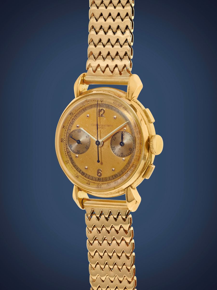 La referenza 4178 fu in produzione dal 1940 alla metà degli anni ‘60, e rappresenta uno dei cronografi vintage Vacheron Constantin piú iconici e ricercati dai collezionisti. Realizzato in diversi design e combinazioni, é stato reso celebre dalla sua cassa di dimensioni importanti per l'epoca, 36mm, che sembrava al polso anche più grande grazie alle distintive anse a goccia, cifra stilistica Vacheron Constantin.L'orologio in catalogo presenta una patina unica, con il quadrante originariamente champagne virato a un seducente colore a due toni tra lo champagne e l'arancio.