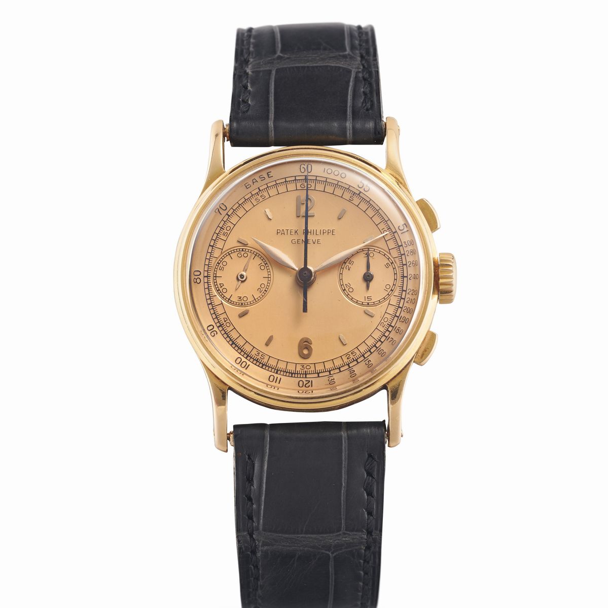 Note: Prodotta per tre decadi, dal 1934 al 1964, la referenza 130 rappresenta l’archetipo del cronografo Patek Philippe d’epoca con linee Calatrava. Nonostante questo lungo periodo di produzione, venne realizzato un numero abbastanza ridotto di esemplari, circa 1500.Le casse, realizzate prevalentemente in oro giallo, vennero prodotte in numero molto più ristretto anche in oro rosa, acciaio e acciaio-oro. Al meglio delle nostre ricerche, meno di 160 pezzi in oro rosa sono conosciuti sul mercato.I quadranti furono anch’essi oggetto di grande sperimentazione, con diverse grafiche, indici, numeri e scale di misurazione. L’orologio proposto in catalogo esprime una delle configurazioni più ricercate dai collezionisti: la cassa in oro rosa mostra volumi pieni e punzonature profonde, mentre il quadrante, dallo stupendo color salmone, presenta scritte indelebili alte e vivide.