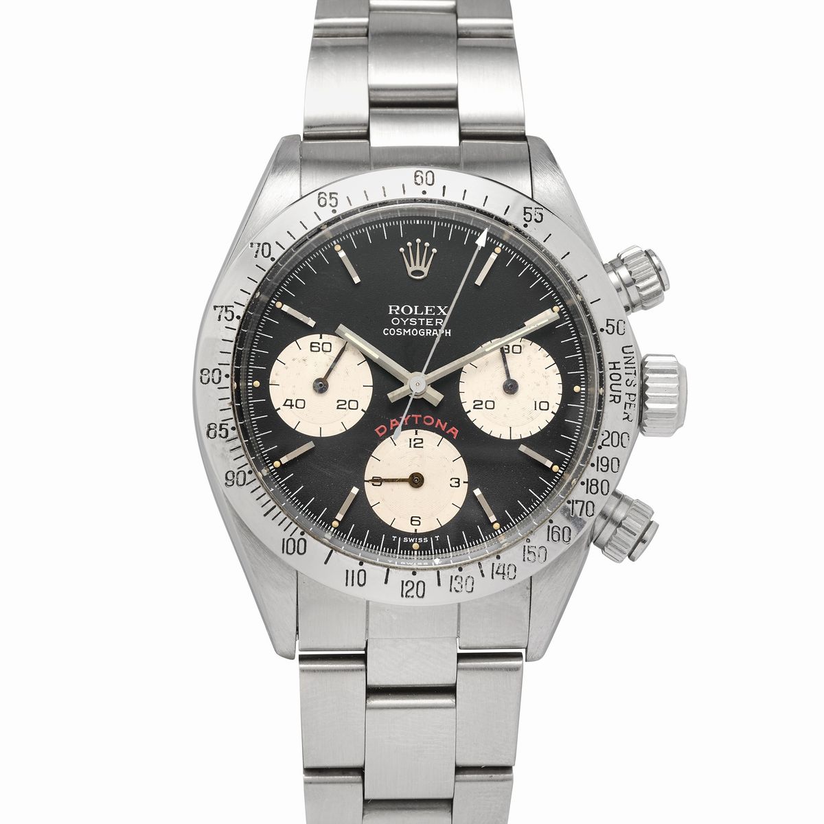 Note: Il Daytona 6265 venne presentato al mercato nel 1969, insieme alla referenza gemella 6263; rimasero in produzione sino alla fine degli anni 80, quando Rolex introdusse il suo primo cronografo con movimento automatico, la referenza 16520. Visto il lungo periodo in cui rimasero in commercio, il 6263 e il 6265 sono forse i due modelli Daytona per eccellenza: l’orologio in catalogo rappresenta la versione più iconica e desiderata dai collezionisti, con la scritta Daytona stampata in grandi caratteri rossi e denominata appunto “Big Red”.Ulteriore dettaglio di interesse collezionistico di questo orologio è il seriale "R3" di ultimissima serie, oltre che la presenza della sua garazia d'origine.
