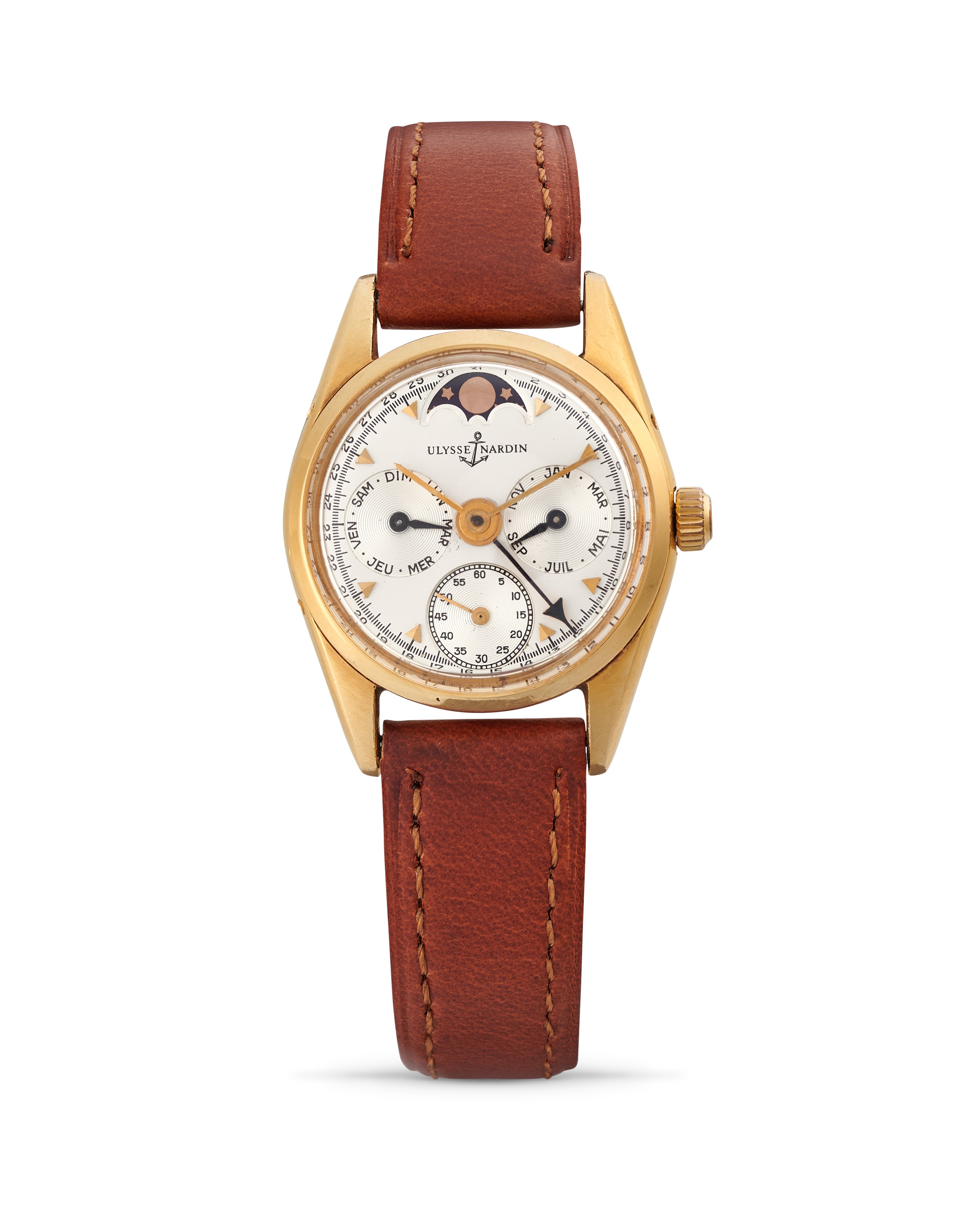 Quadrante argenté, indici applicati, indicazione della data, giorno della settimana, mese e fasi della luna.