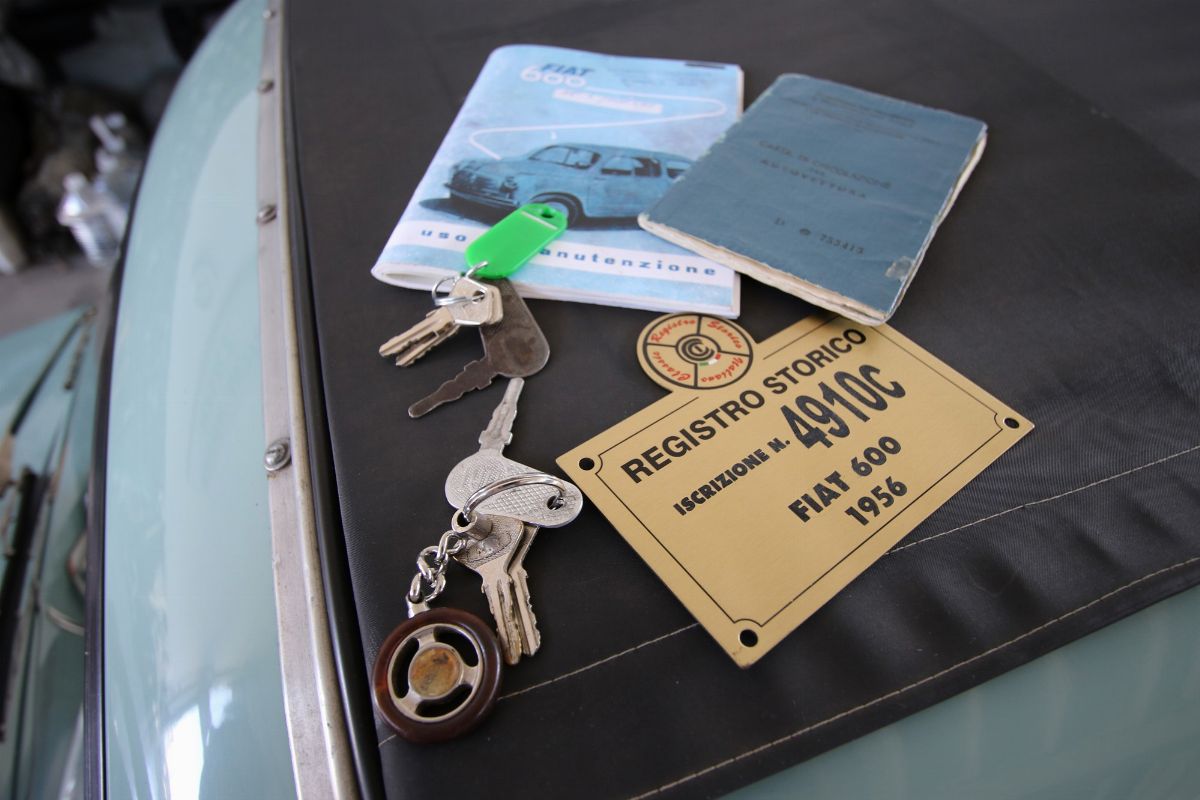 La Fiat 600, con telaio no. 100*182541 del 1956 è un esemplare della I serie, prodotta dal marzo 1955 al febbraio 1957, le cui specifiche erano: motore da 633 cc, carburatore Weber 22 DRA per 21,5 hp a 4.600 giri/min. La velocità massima era di circa 90 km/h, un valore rispettabile per un’utilitaria dell’epoca. Le portiere “a vento”, erano incernierate posteriormente, come si affermava allora nei comunicati pubblicitari, anche per agevolare un ingresso ed un’uscita “dignitosi” per le signore automobiliste in gonna, un nuovo e importante bacino d’utenza del modello. Le porte avevano vetri scorrevoli, gli indicatori di direzione erano sui parafanghi come sulla Topolino. Sul muso, il fregio tondo "600" con 6 singoli baffi in alluminio. In basso sulla coda, fanalini posteriori piccoli con base in alluminio; l’indicatore di direzione compare solo dagli esemplari prodotti dal febbraio 1956. La versione a tetto apribile in tela, definita dalla casa “trasformabile” viene introdotta poco più tardi, nel 1956, insieme alla versione Multipla. La Fiat 600, con telaio no. 100*182541 è, pertanto, uno dei primissimi esemplari prodotti di “trasformabile”: monta ancora i fanalini posteriori di primo tipo, con indicatori di direzione separati, aggiunti in seguito, per rispetto del nuovo codice della strada. La vettura si presenta in uno stato eccellente a seguito di restauro. La carrozzeria è verniciata nel caratteristico colore “azzurro cenere” con cerchi bicolore azzurro cenere/crema; tutti i dettagli sono corretti. Monta pneumatici a fascia bianca. Gli interni risultano curati; i sedili sono rivestiti con il corretto tessuto a quadretti, specifico delle Fiat 600 I serie e 1100 e vinilpelle. Corretti i tappetini in gomma. L’auto monta delle trombe pneumatiche bitonali, accessorio tipico dell’epoca. Completano la dotazione le doppie chiavi ed il manuale di uso e manutenzione. La vettura è ancora immatricolata con le targhe nere d’origine della provincia d’Isernia, che aggiungono un tocco alla piccola magia di questo esemplare, per il numero bassissimo. Conservato anche l’originale libretto “a pagine”. Meccanica completamente revisionata, con motore non matching, ma del tipo corretto. La scelta di Fiat 600 sul mercato è ampia, con ampi ventagli di prezzi e stime. Alcuni esemplari fanno la differenza. Altri la fanno ancora di più. Occasioni rare.