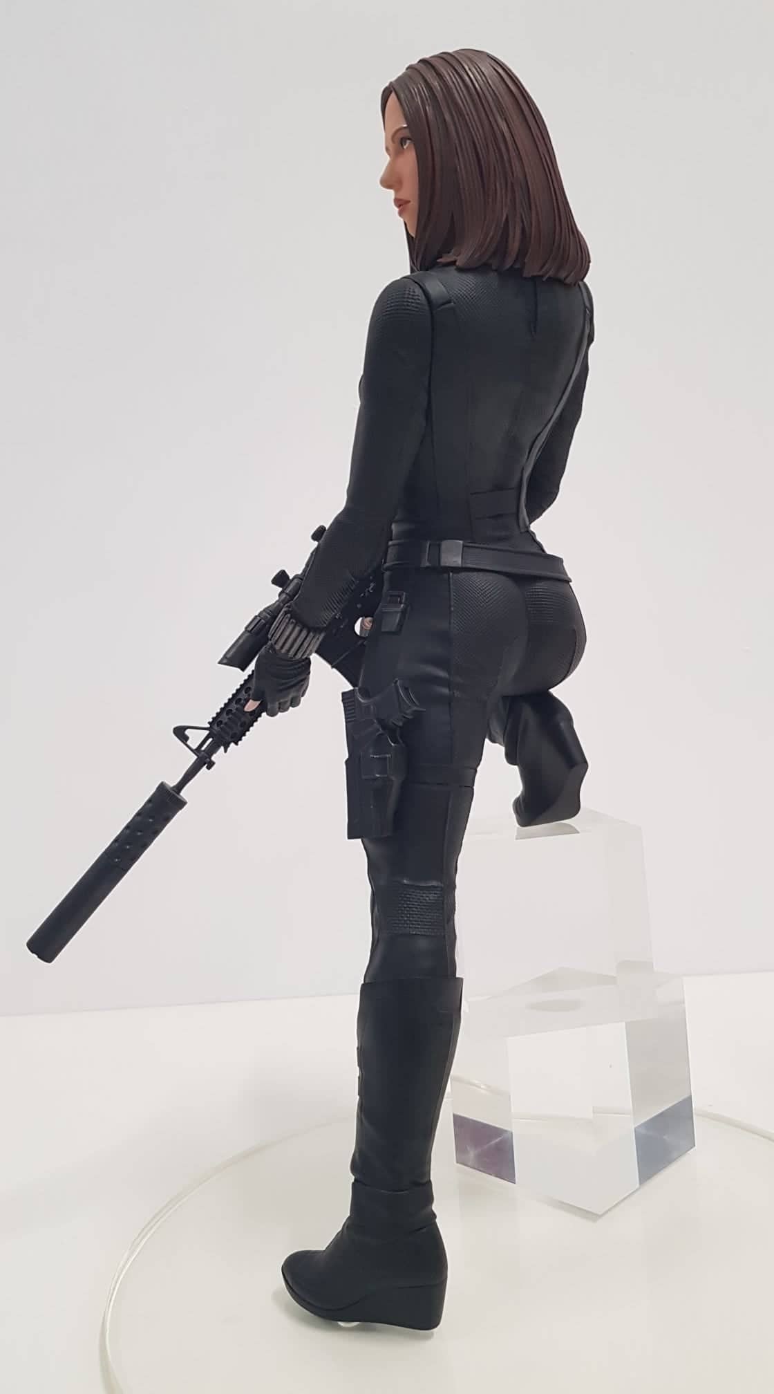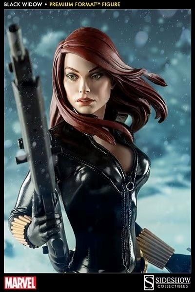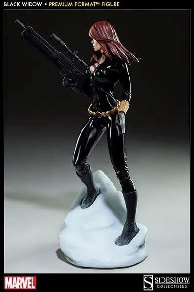 Action figure di Black Widow (Vedova Nera), celebre personaggio dei fumetti Marvel, realizzata da Sideshow Collectibles per la linea "Premium Format Figure". Natasha Romanoff indossa la sua classica tuta tattica nera in tessuto sintetico lucido (stile pelle o lattice), che riflette la luce accentuando il dinamismo della posa. Indossa la caratteristica cintura dorata composta da dischi e i bracciali metallici coordinati ("Widow's Bite"), anch'essi color oro. Impugna un fucile d'assalto nella mano destra (rivolto verso l'alto) e una pistola con silenziatore nella mano sinistra, puntata in avanti. Limited edition di 1500 pezzi.
