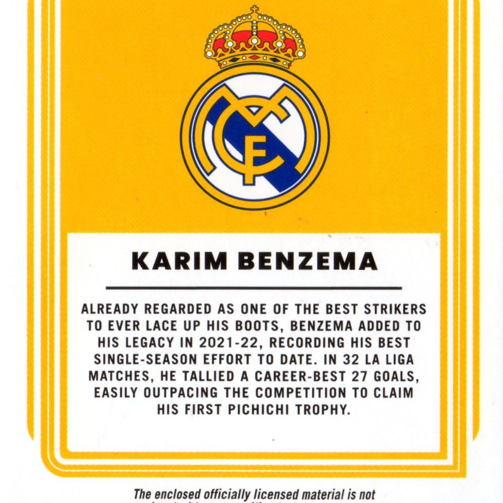 Relic card di Karim Benzema prodotta e certificata dalla Panini nel 2023. La card contiene il frammento di una sua divisa da gioco.