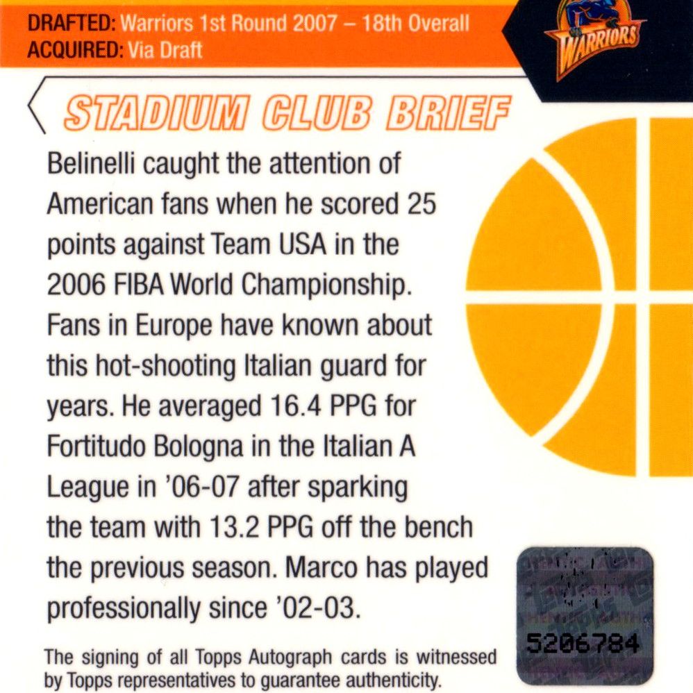 Card autografata da Marco Belinelli, prodotta e certificata dalla Topps nel 2007.