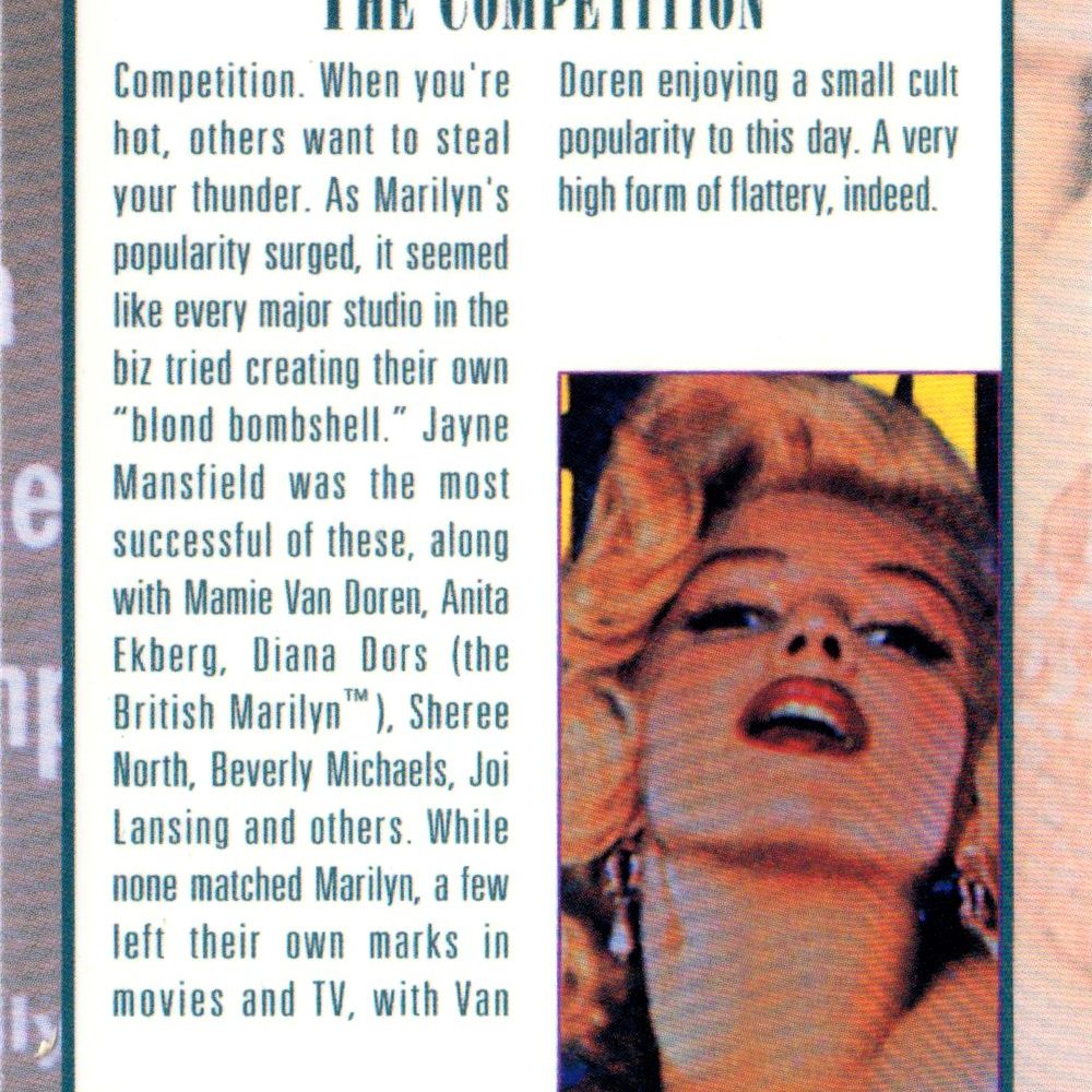 Marilyn Monroe, pseudonimo di Norma Jeane Mortenson Baker Monroe (Los Angeles, 1º giugno 1926 – Los Angeles, 4 agosto 1962), è stata un'attrice, cantante e modella statunitense, tra le più iconiche attrici della storia del cinema. I film Giungla d'asfalto e Eva contro Eva, entrambi del 1950, furono i suoi primi successi di pubblico. Negli anni successivi, le sue interpretazioni in Niagara e Gli uomini preferiscono le bionde vennero apprezzate dalla critica e le valsero un Henrietta Award ai Golden Globe 1954. La definitiva consacrazione internazionale avvenne poi con le pellicole Come sposare un milionario, Quando la moglie è in vacanza, Fermata d'autobus e A qualcuno piace caldo, per la quale vinse un Golden Globe per la migliore attrice in un film commedia o musicale nel 1960. Fra i successi come cantante vi sono My Heart Belongs to Daddy di Cole Porter, Bye Bye Baby e Diamonds Are a Girl's Best Friend, inserite in Gli uomini preferiscono le bionde, e I Wanna Be Loved by You, cantata in A qualcuno piace caldo. Per il suo fascino e la sua sensualità venne inoltre ritratta in numerose foto di pubblicità e di riviste, diventando un simbolo fuori da ogni tempo. Negli anni e nei decenni successivi alla sua morte, la Monroe è diventata una vera e propria icona della cultura pop.
