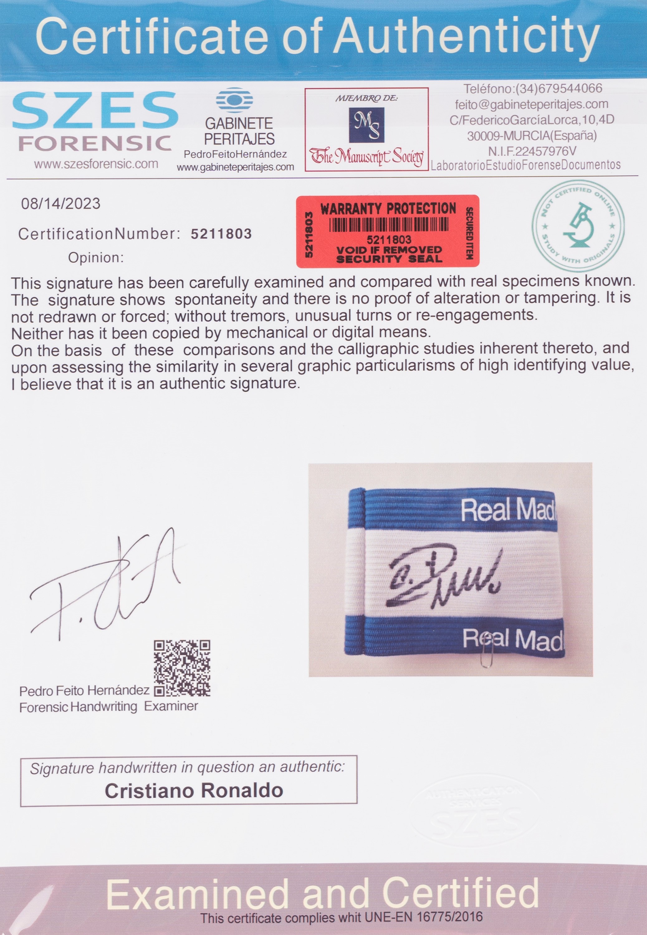 Fascia da capitano del Real Madrid autografata da Cristiano Ronaldo, con certificato di perizia che ne attesta l’autenticità.Cristiano Ronaldo, il cui nome completo è Cristiano Ronaldo dos Santos Aveiro, è un calciatore portoghese nato il 5 febbraio 1985 a Funchal, Madeira, Portogallo. Ronaldo è ampiamente considerato uno dei migliori calciatori della storia del calcio e ha avuto un impatto significativo su diverse squadre e competizioni.