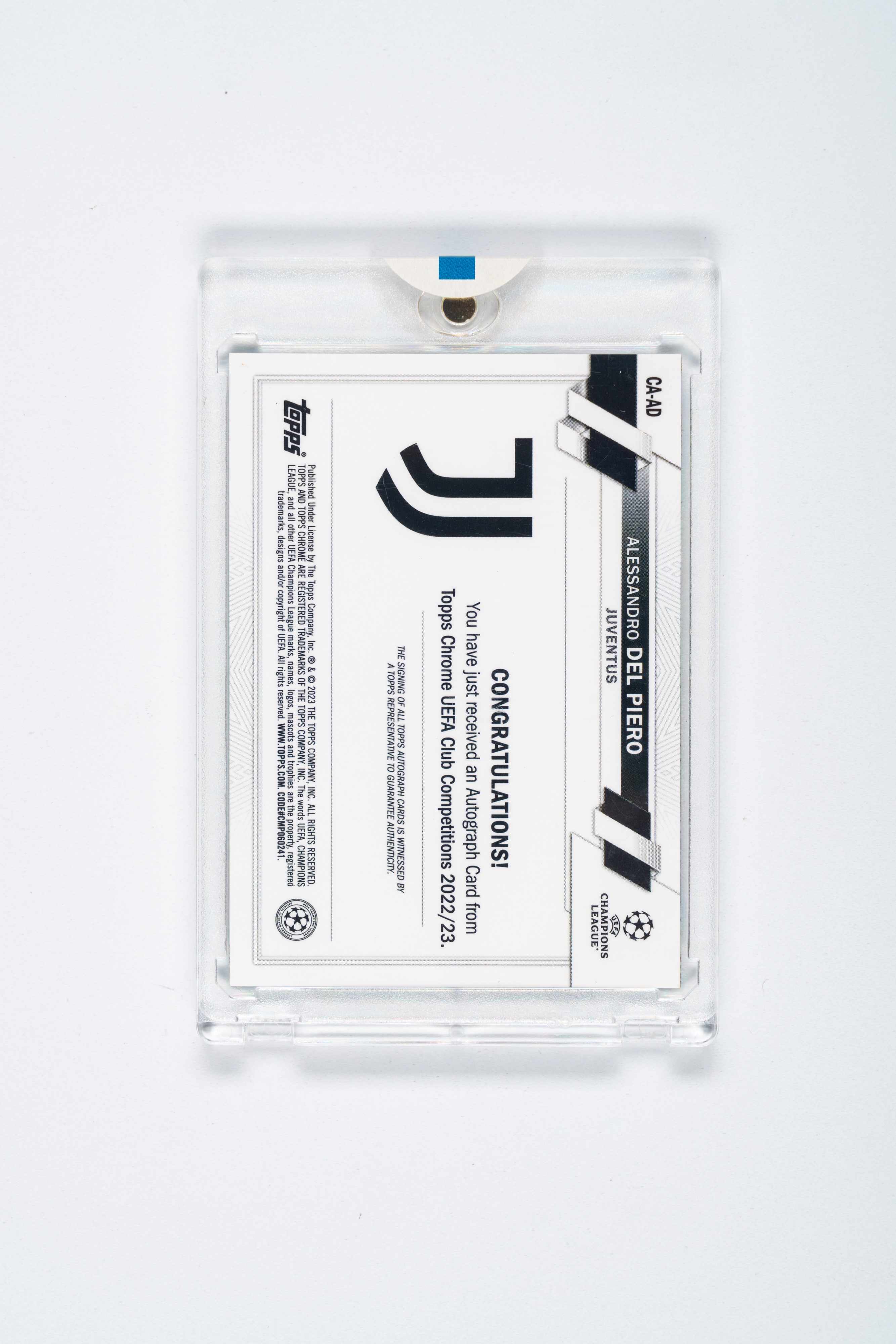 Card autografata di Alessandro De Piero con la maglia della Juventus, pubblicata dalla Topps per la serie Chrome Aqua Lava del 2022. Alessandro Del Piero. Un nome, una storia, un'icona. La sua epopea con la maglia della Juventus è una delle narrazioni più affascinanti e longeve del calcio italiano, un legame indissolubile durato diciannove stagioni e costellato di gol, trofei, momenti indimenticabili e un amore incondizionato da parte dei tifosi. In diciannove stagioni con la Juventus (dal 1993 al 2012), Alessandro Del Piero ha collezionato l'incredibile cifra di 705 presenze ufficiali, siglando 290 gol, che lo rendono il miglior marcatore di tutti i tempi della Juventus e il giocatore con più presenze nella storia del club. Numeri che da soli raccontano una carriera straordinaria. Il suo palmarès con la Juventus è ricco di trofei, tra i quali spiccano 8 Scudetti: 1994-1995, 1996-1997, 1997-1998, 2001-2002, 2002-2003, 2011-2012 (a cui si aggiungono i due revocati nel 2005 e 2006). E la UEFA Champions League: 1995-1996.