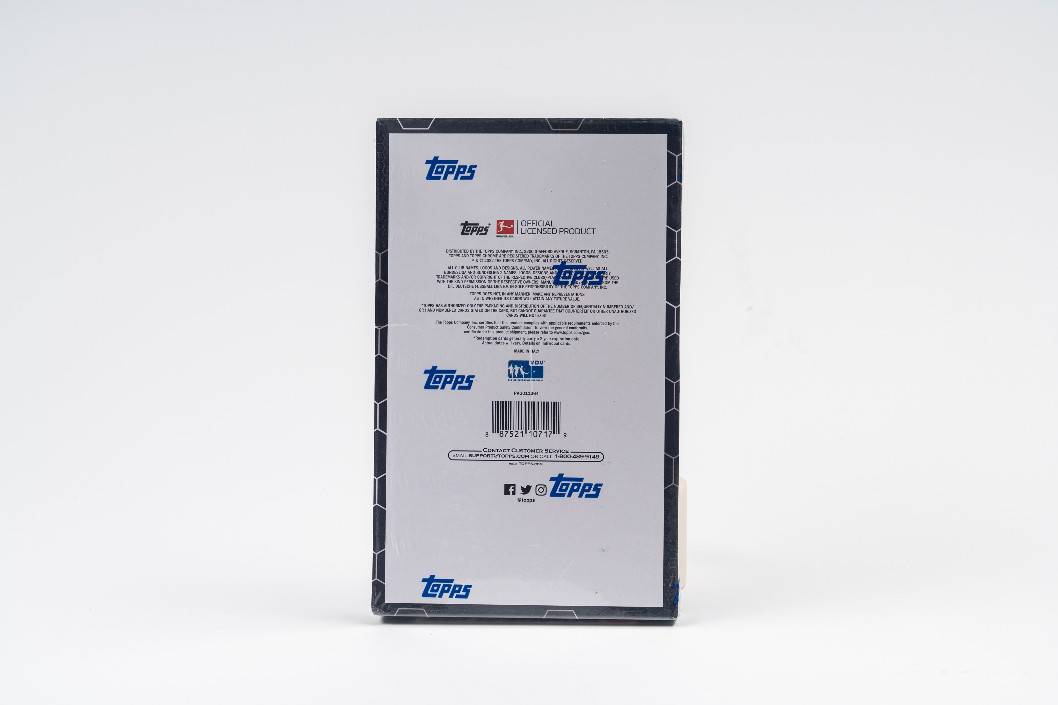 Box sigillato della Topps per la serie Chrome Bundesliga Soccer del 2021/22. All’interno del box ci sono 18 pacchetti con 4 card ciascuno. Tra le card è assicurata una con l’autografo originale di un giocatore della Bundesliga: se si è molto fortunati si può anche trovare una di Erling Haaland con la maglia del Borussia.
