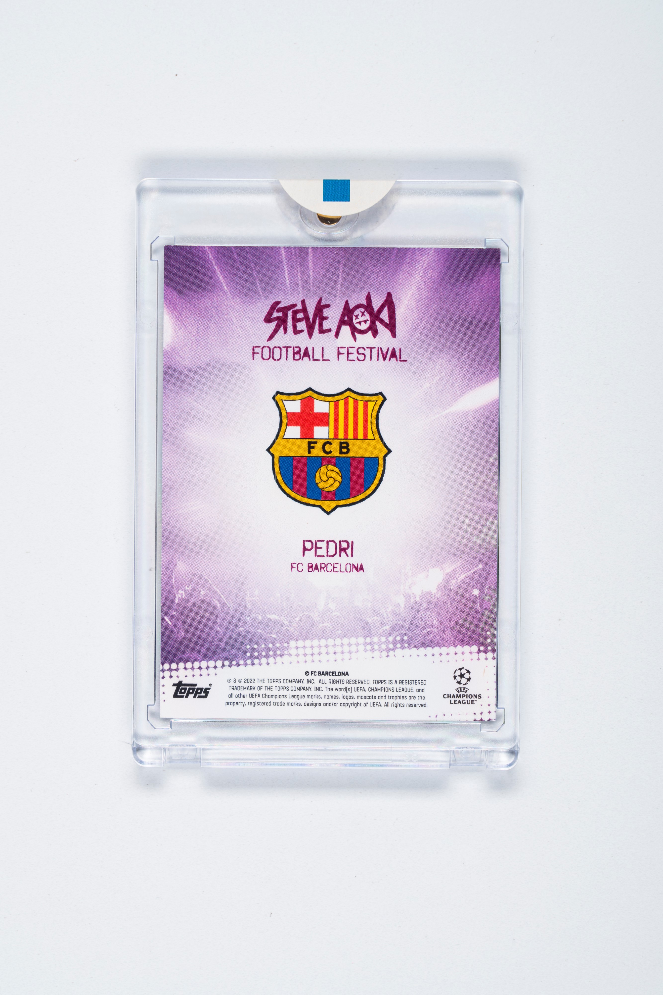 Card autografata di Pedri con la maglia del Barcellona, pubblicata dalla Topps per la serie UCL Steve Aoki del 2022. Numerata su 25.