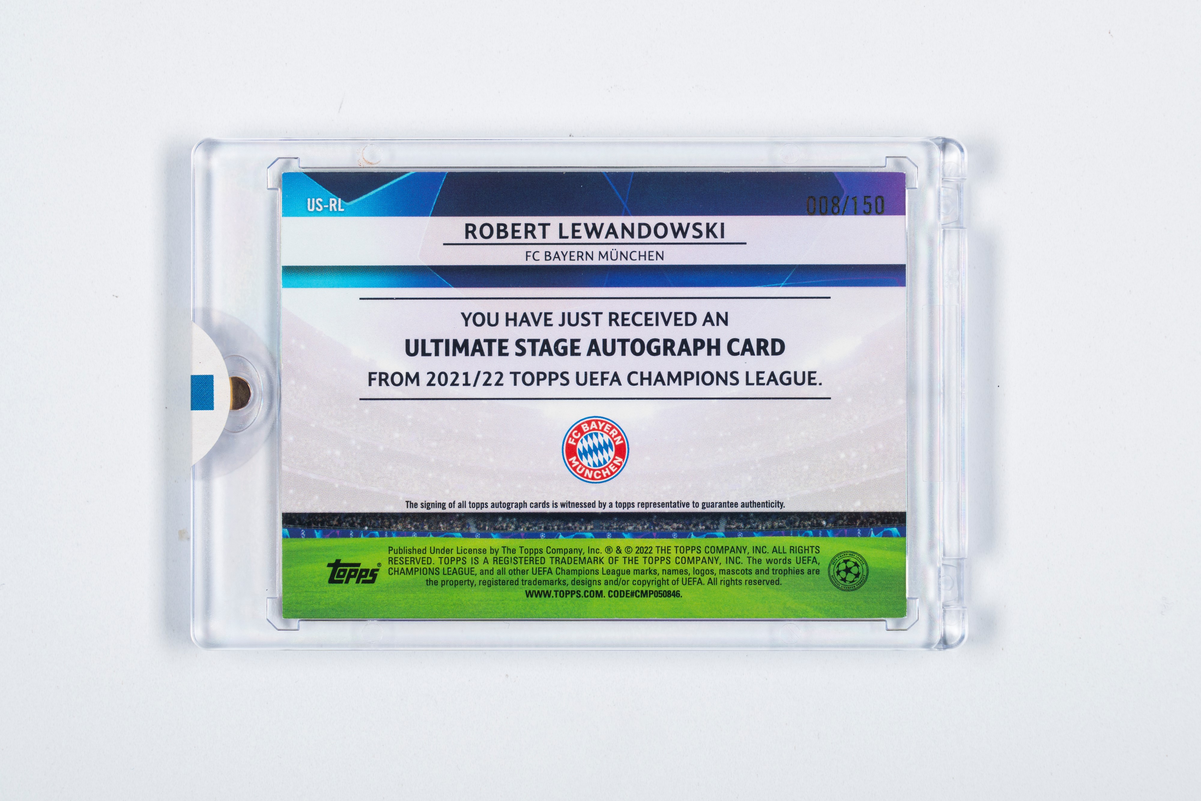 Card autografata di Robert Lewandowski con la maglia del Bayern Monaco, pubblicata dalla Topps per la serie Ultimate Stage 2021. Numerata su 150. Robert Lewandowski ha avuto una parentesi straordinariamente prolifica e ricca di successi con il Bayern Monaco. Arrivato nell'estate del 2014 dal Borussia Dortmund, l'attaccante polacco è diventato una vera e propria leggenda del club bavarese, infrangendo numerosi record e conquistando una quantità impressionante di trofei. Lewandowski ha stabilito e battuto numerosi record con la maglia del Bayern, tra i quali il record di gol in una singola stagione di Bundesliga: 41 gol nella stagione 2020-21, superando il precedente record di 40 stabilito da Gerd Müller. Con il Bayern Monaco, Lewandowski ha dominato il calcio tedesco, vincendo otto Bundesliga consecutive (dal 2014-15 al 2021-22). Questa striscia di successi testimonia la sua costanza e il suo contributo fondamentale al dominio del club in Germania. Ha inoltre conquistato tre Coppe di Germania e cinque Supercoppe di Germania. Il culmine della sua carriera al Bayern è stato il trionfo nella Champions League nella stagione 2019-20. Lewandowski è stato capocannoniere della competizione con 15 gol e ha giocato un ruolo cruciale nella vittoria finale. Ha anche vinto la Supercoppa UEFA e la Coppa del Mondo per club FIFA con il Bayern.