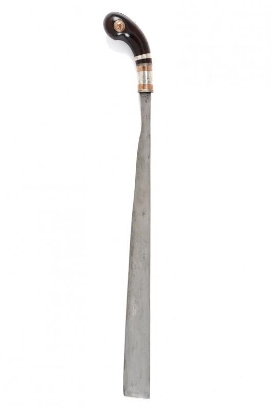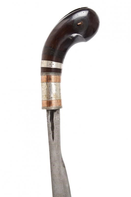 datazione: XIX Secolo provenienza: Sumatra, Lama a un filo rastremata alla base con punta piatta. Impugnatura in legno con pomo angolato decorato con fornimenti in metallo bianco e rame (mancanze), tipico delle tribù dei Karo-Batak. Privo di fodero. lunghezza 65.7 cm.