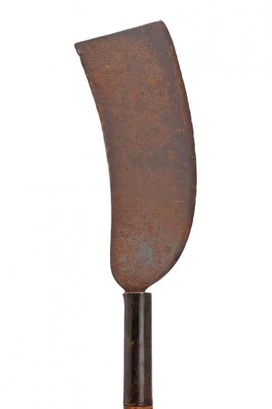 datazione: XIX Secolo provenienza: Assam, Larga lama curva a un filo. Fusto in bambù con gorbia in ferro, parzialmente rivestito con fibra e corda vegetale. lunghezza 75 cm.