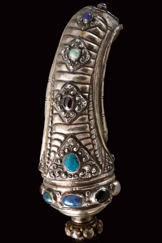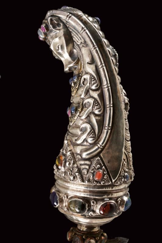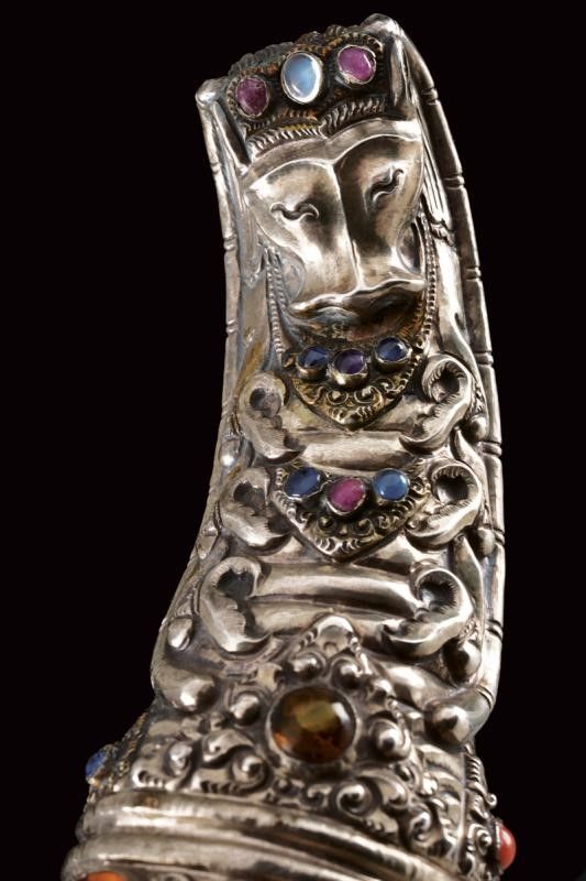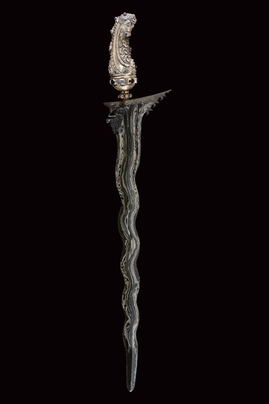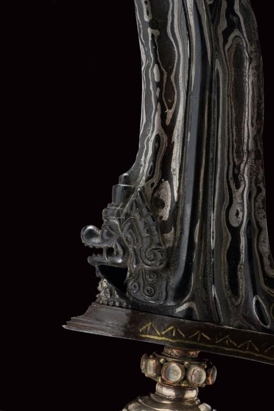datazione: XX Sec. provenienza: Bali, Pesante lama in bel pamor a due fili ondulati, con base intagliata con un drago e con scanalature, ganja con tarsie in ottone. Ukiran rivestito di lamina d'argento, sbalzato a effigiare una divinità decorata con pietre colorate, come anche il mendak. Privo di fodero. lunghezza 58.8 cm.