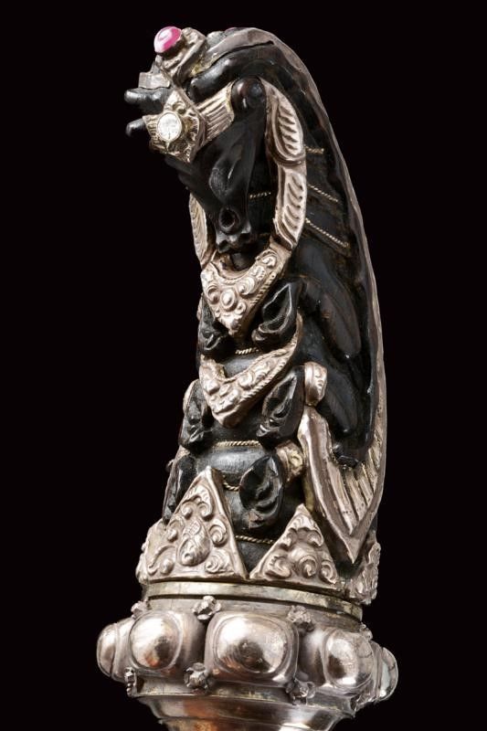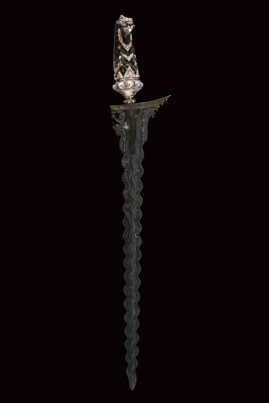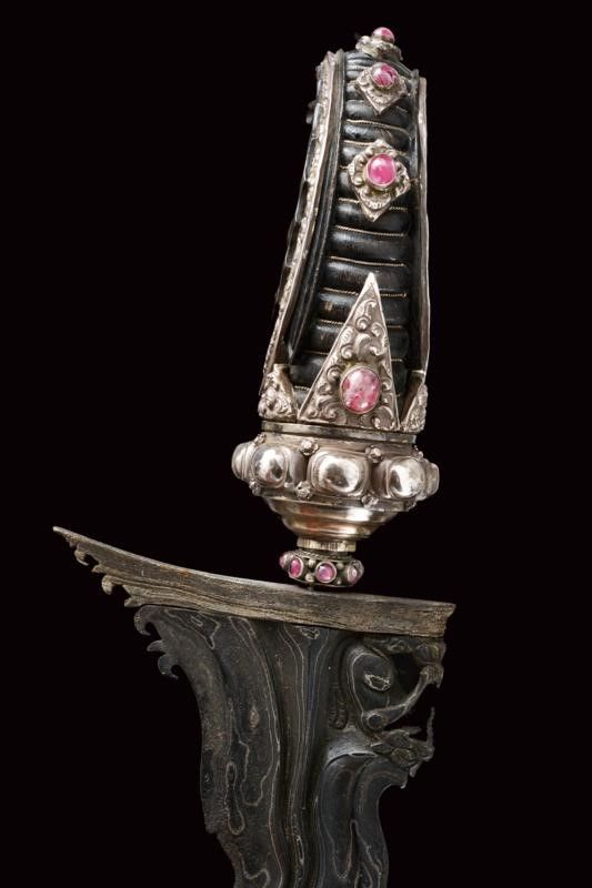 dating: XVIII/XX Secolo provenance: Bali, Interesting and long, meticulously worked, double-edged blade with central rib, the base carved with grooves, in-the-round naga and with curls (18th / 19th century), fine wooden hilt of kocet-kocetan type finely carved and decorated with silver mounts and colored stones, silver mendak with colored stones and silver selut. Without scabbard. length 60.5 cm.