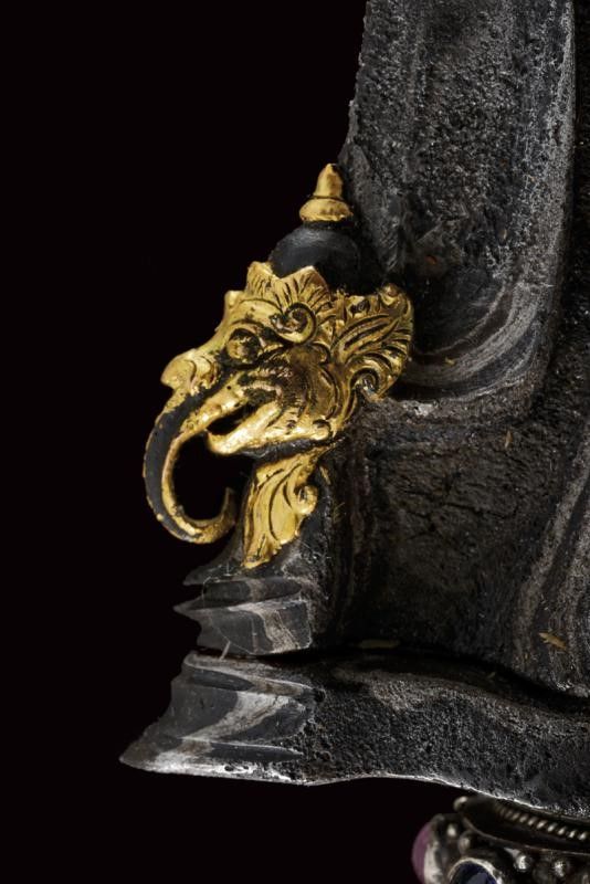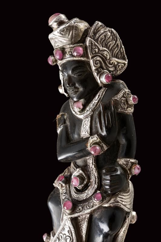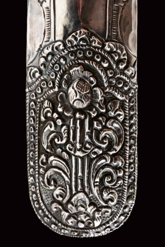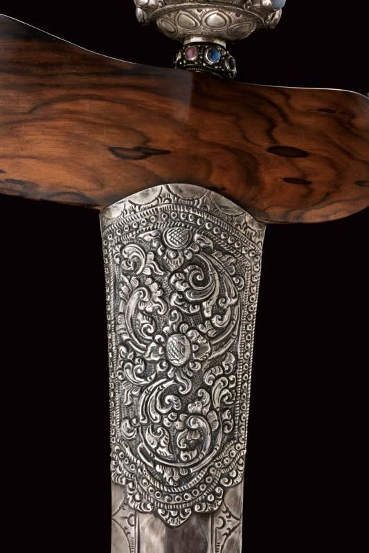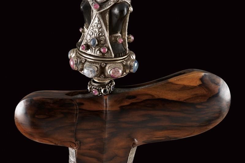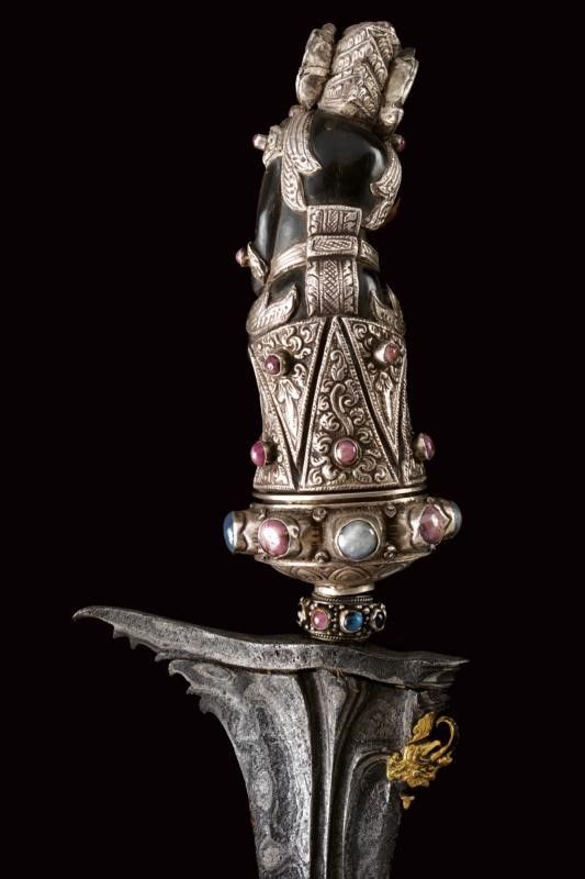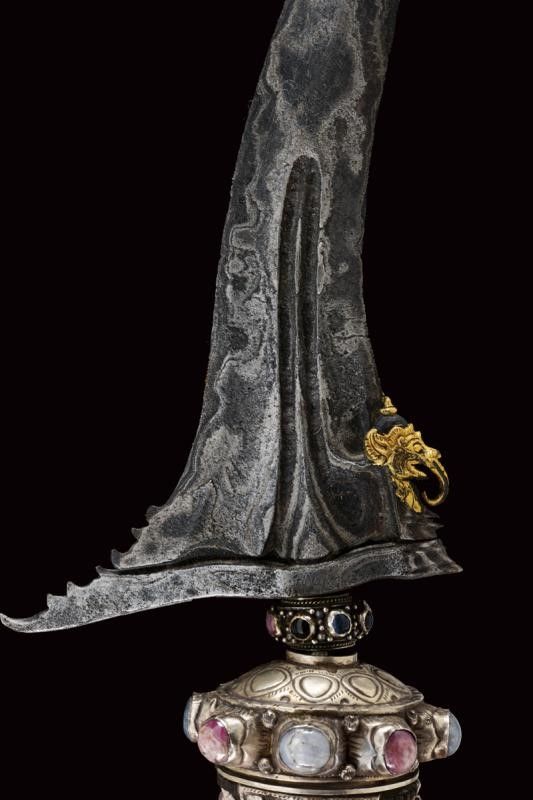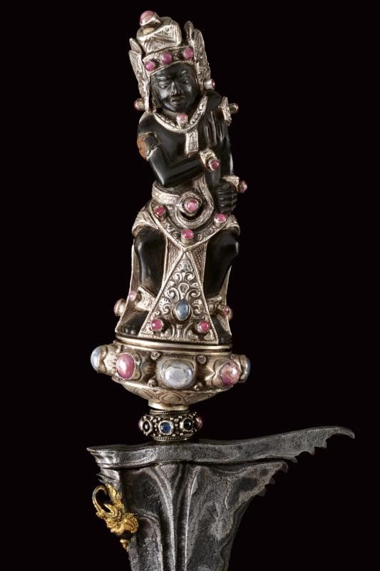 datazione: XIX/XX secolo provenienza: Bali, Lama in fine pamor, a due fili poco ondulati, intagliata alla base con effige di una creatura divina parzialmente dorata, recante duplice scanalatura. Ukiran in corno scuro raffigurante una divinità decorata con fornimenti in argento inciso e ornata da pietre colorate (piccola mancanza). Mendak decorato en suite. Warangka in legno con pendok in lamina argento, incisa e parzialmente sbalzata a motivi floreali. lunghezza 51 cm.