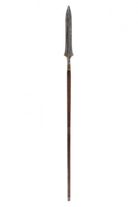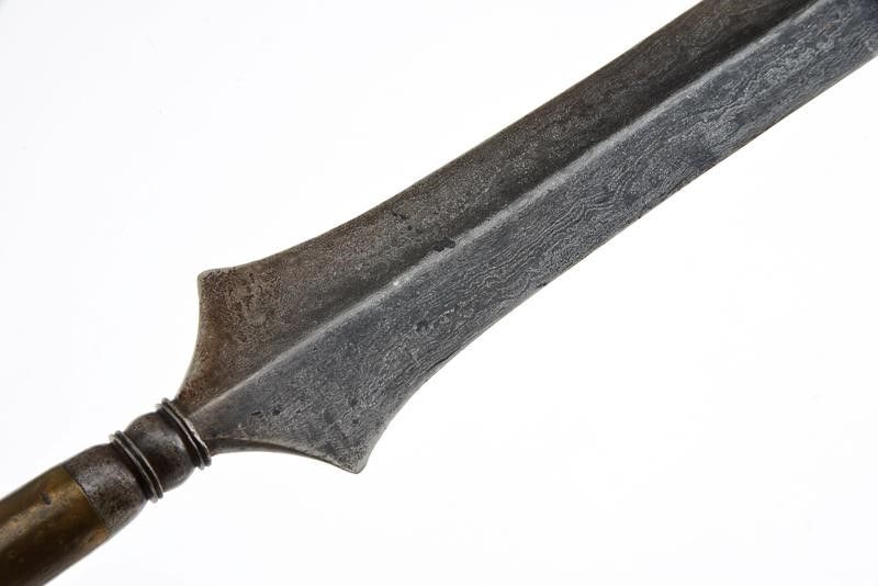 datazione: XIX Secolo provenienza: Filippine, Cuspide in pamor di finissima struttura, a due fili, costolata in mezzeria, ingrossata alla base; nodo in ferro, gorbia in ottone su fusto cilindrico in legno. lunghezza 94 cm.