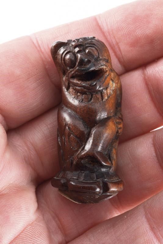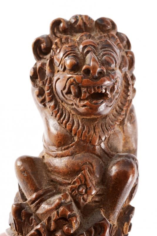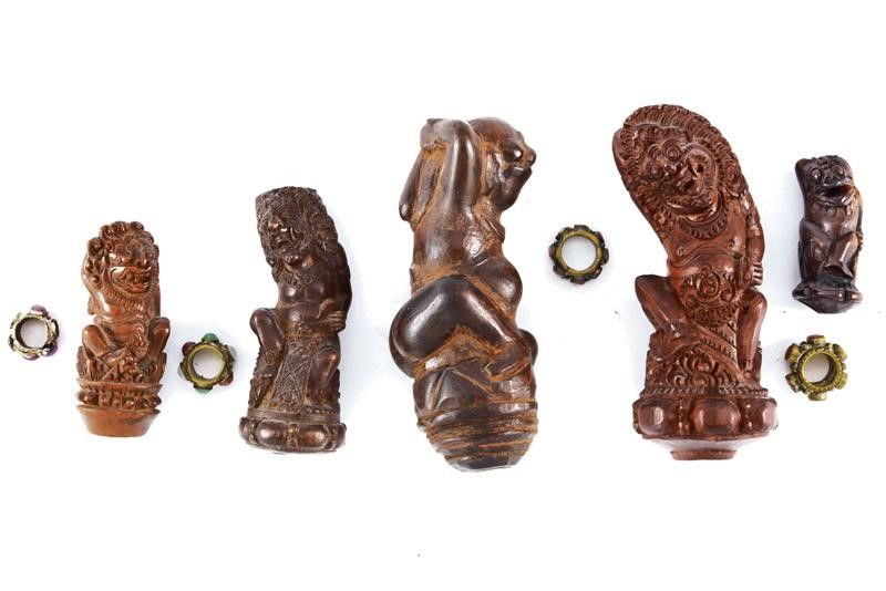datazione: inizio del XX Sec. provenienza: Bali, Tutti in legno finemente scolpito. Complete di un supporto espositivo. altezza 4.5 - 12 cm.