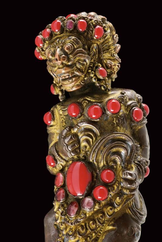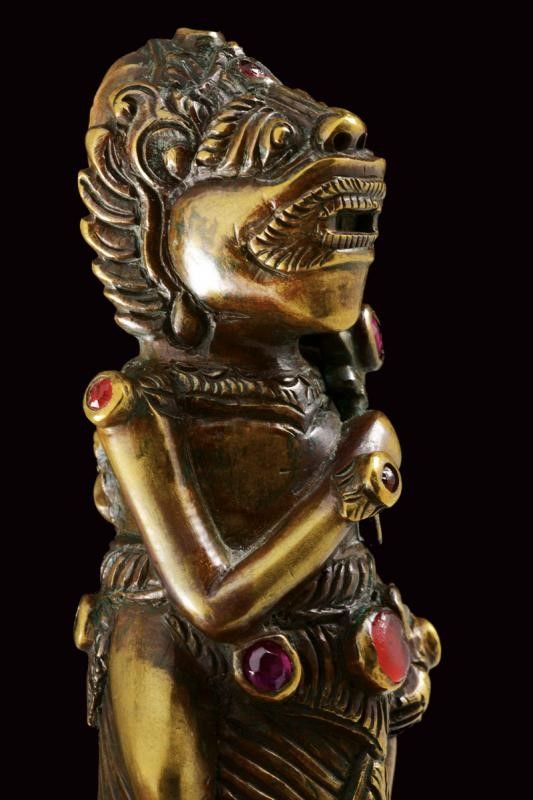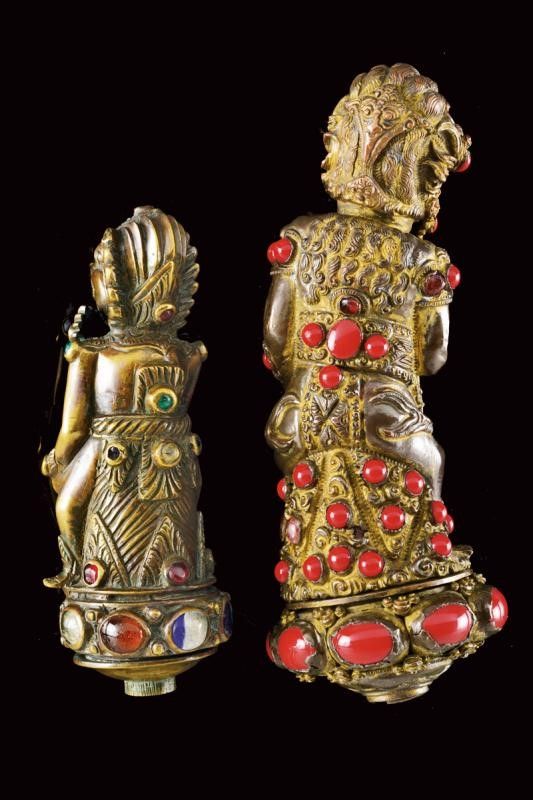 datazione: XX Sec. provenienza: Bali, In ottone, raffiguranti divinità riccamente incise e arricchite con pietre colorate. altezza 11.5 - 15 cm.