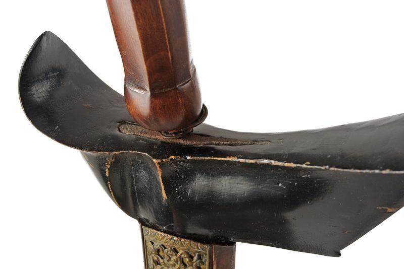 datazione: Prima metà del XX Secolo provenienza: Giava, Interessante lama a due fili lisci in pamor con due inserti. Ukiran in legno scolpito a motivi floreali, mendak in metallo. Warangka in legno con pendok in metallo, la parte anteriore incisa e riccamente traforata. lunghezza 43.5 cm.