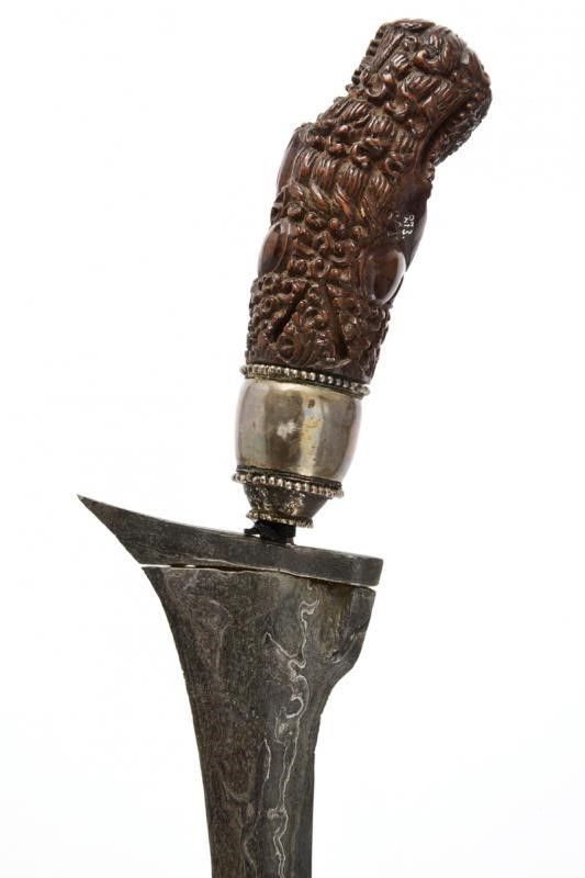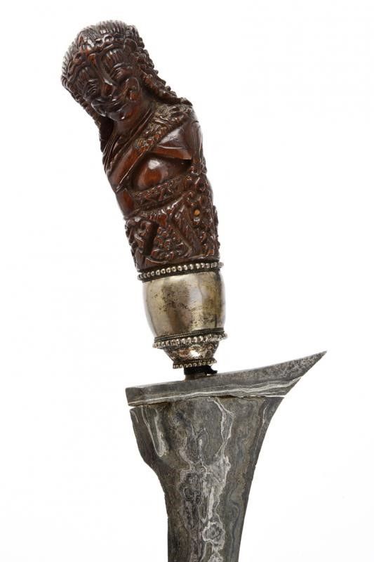 datazione: XVI - XIX Secolo provenienza: Giava, Antica lama del XVI/XVII secolo a due fili lisci in bellissimo pamor, dotata di base leggermente sgusciata. Impugnatura in legno scolpito con una divinità (XVIII/XIX secolo) con mendak in argento decorato con anelli perlinati. Kris raro ed antico. lunghezza 41 cm.