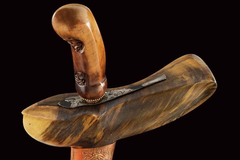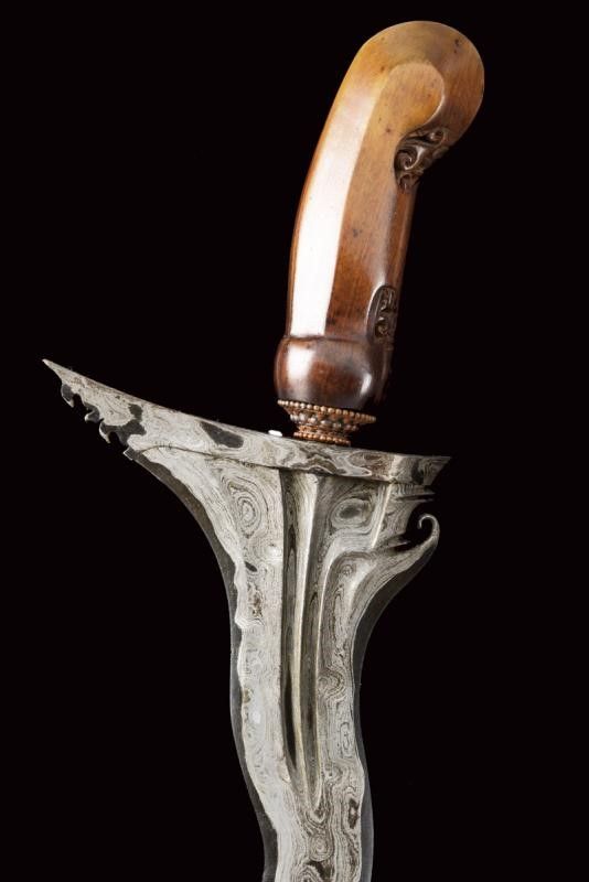 datazione: XX Sec. provenienza: Yogyakarta, Lama a due fili ondulati, in fine pamor, con base scanalata ed intagliata. Tipico ukiran in legno con mendak in metallo. Warangka in legno con pendok in lamina di rame riccamente sbalzato a motivi floreali. lunghezza 45.5 cm.