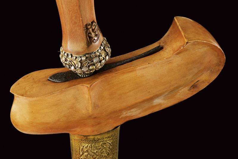datazione: XX Sec. provenienza: Giava, Lama dritta a due fili lisci in pamor con base scanalata ed intagliata. Ukiran in legno leggermente scolpito a motivi floreali, mendak e selut in ottone decorato a pietre bianche ed in filigrana. Warangka in legno con pendok in lamina d'ottone inciso a motivi floreali. lunghezza 47.5 cm.