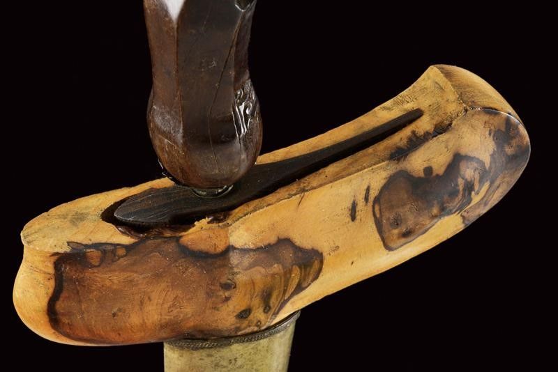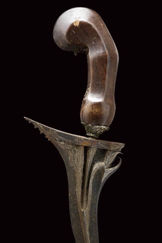 datazione: XX Sec. provenienza: Giava, Lama a due fili ondulati, in fine pamor, con base intagliata e scanalata. Ukiran in legno leggermente scolpito a motivi floreali, mendak in metallo danneggiato. Warangka in legno con pendok in lamina d'ottone. lunghezza 47 cm.