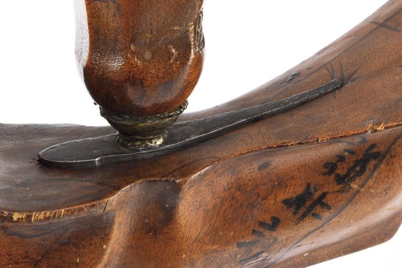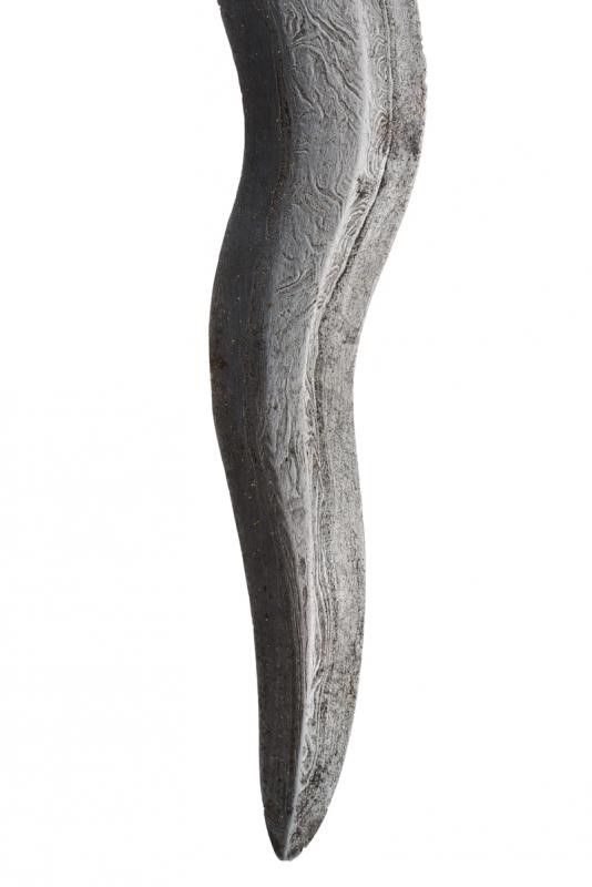 datazione: XIX Secolo provenienza: Giava, Larga lama a due fili ondulati con un bellissimo pamor che ricorda quasi il damasco, la base intagliata e scanalata. Ukiran in legno scolpito, semplice mendak in ottone. Fodero in legno con breve iscrizione realizzata a mano simile agli ideogrammi giapponesi. lunghezza 46 cm.
