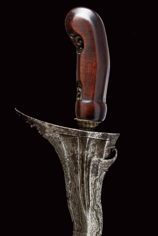 datazione: XIX Secolo provenienza: Yogya, Lama a due fili ondulati in pamor, di buona qualità, con base intagliata e recante profonde scanalature. Ukiran in legno con tipici intagli, mendak in ottone decorato a pietre. Warangka (crepa nella parte posteriore) in legno con pendok in lamina d'ottone inciso, con volatili fra disegni floreali. lunghezza 44.5 cm.