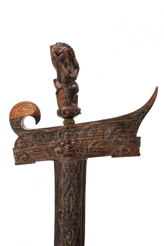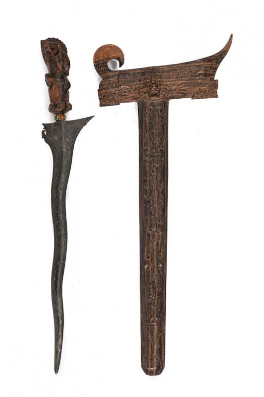 datazione: XX Sec. provenienza: Bali, Lama antica ondulata a due fili, in fine pamor. Mendak in metallo dorato con pietre colorate a cabochon. Impugnatura intagliata a effigiare Bhima, con lunghissima unghia alla mano destra, fiore di Shiva nella sinistra e il simbolo della mezzaluna fra gli occhi (ad indicare la presenza del Terzo Occhio). Wrangka e gandar in legno intagliato. lunghezza 51 cm.