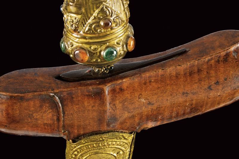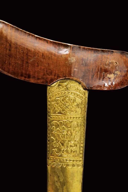 datazione: XIX/XX secolo provenienza: Bali, Lama del XIX secolo in pamor a due fili ondulati, la base intagliata e fortemente scanalata; zone con danni da ruggine. Bruta Nawasari ukiran di epoca successiva, rivestito con lamina d'ottone e decorato con cabochon in vetro colorato. Warangka in legno con pendok in lamina d'ottone sbalzato a motivi floreali. Piccoli difetti. lunghezza 48.2 cm.