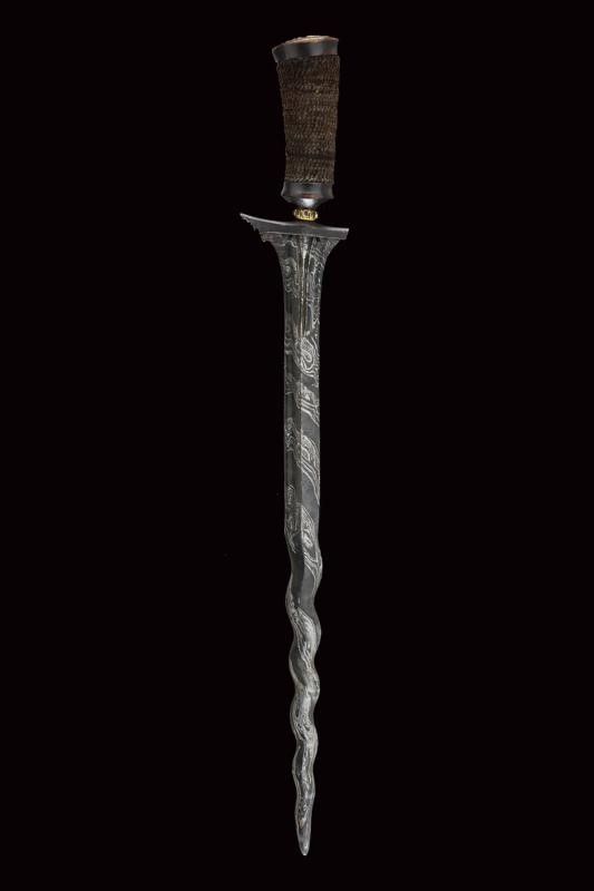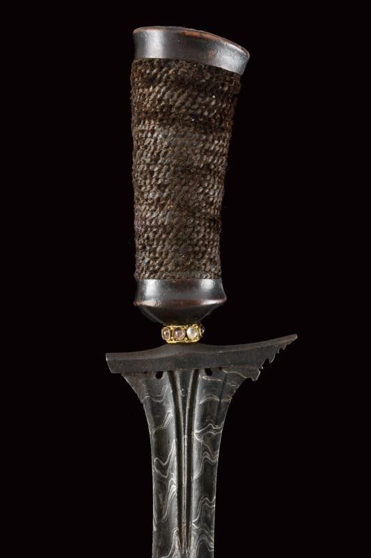 datazione: XIX Secolo provenienza: Bali, Lunga lama prima a fili dritti, poi ondulati, in bel pamor con base scanalata ed intagliata; ukiran in legno in stile loncengan con mendak in metallo decorato a pietre colorate. Privo di fodero. lunghezza 60 cm.