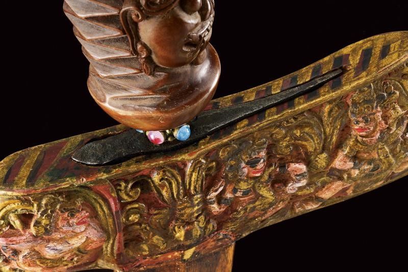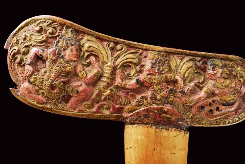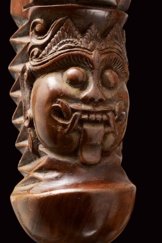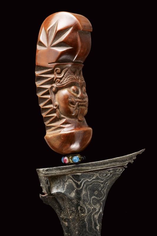 datazione: XX Sec. provenienza: Bali, Lama (del XIX secolo) a due fili ondulati in pamor. Ukiran (fine del XX secolo) in legno, scolpito con un mascherone e a motivi geometrici. Mendak in metallo con pietre colorate. Warangka (inizio del XX secolo) scolpito e dipinto con divinità. Gandar in legno. lunghezza 51.5 cm.