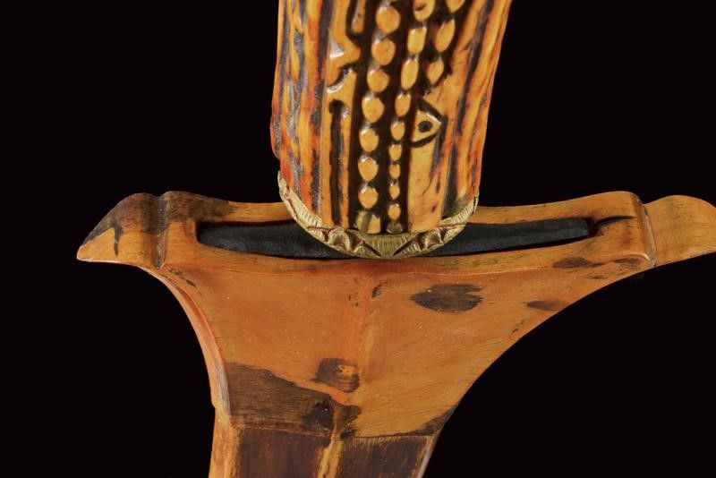 datazione: Fine XIX inizio XX Secolo provenienza: Bali, Lunga lama a due fili lisci in fine pamor; ukiran in corno di cervo (Batak, Sumatra) con mendak in ottone inciso. Fodero in legno. lunghezza 56.3 cm.