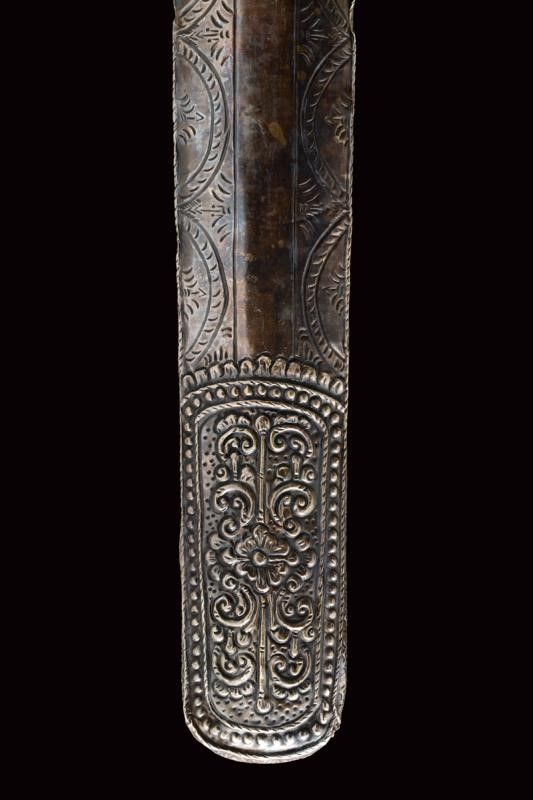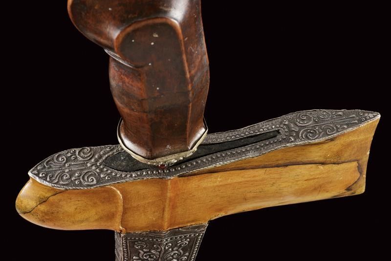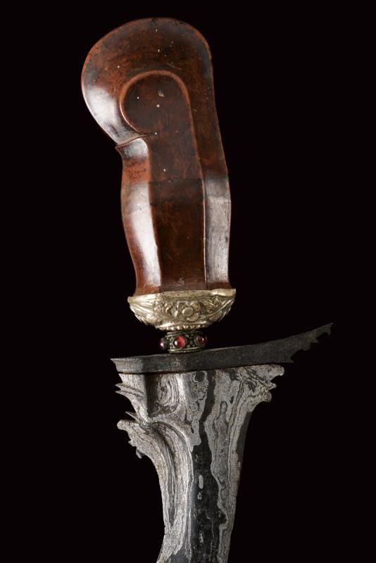 datazione: XIX Secolo provenienza: Bali, Lunga lama a due fili ondulati in fine pamor con base intagliata e con breve sguscio. Ukiran in legno scolpito, con mendak in metallo ornato da pietre a cabochon e selut in argento sbalzato a motivi floreali. Fodero in legno con fornimenti in lamina d'argento sbalzati ed incisi a motivi floreali e geometrici. lunghezza 56.5 cm.