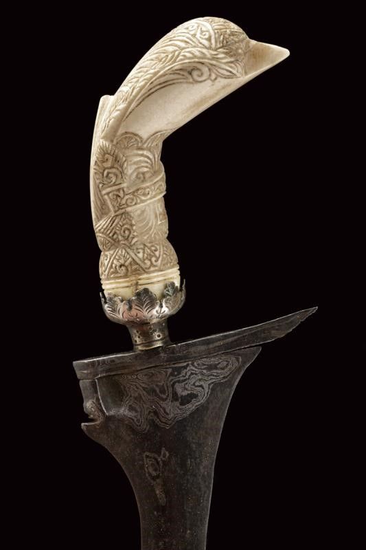 datazione: 1900 circa provenienza: Sumatra, Lama a due fili ondulati con base leggermente intagliata e sgusciata; ukiran in osso scolpito, dotato di mendak in metallo bianco decorato a foglie. Fodero completamente in osso realizzato in vari segmenti attaccati ed inciso a motivi floreali (piccole mancanze e difetti). lunghezza 38 cm.