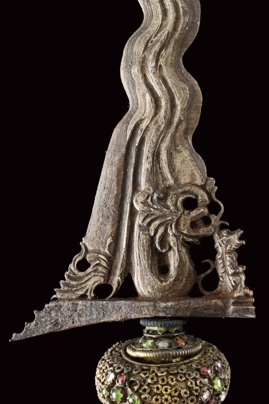 datazione: XX Sec. provenienza: Madura, Lama a due fili fortemente ondulati con base intagliata e traforata con effige di un drago e a motivi floreali (lama più antica, modificata nella seconda meta del XX secolo). Ukiran mancante, bei mendak e selut in metallo decorato con pietre colorate, warangka in legno con pendok in lamina d'ottone, riccamente traforato sul lato anteriore. lunghezza 43 cm.