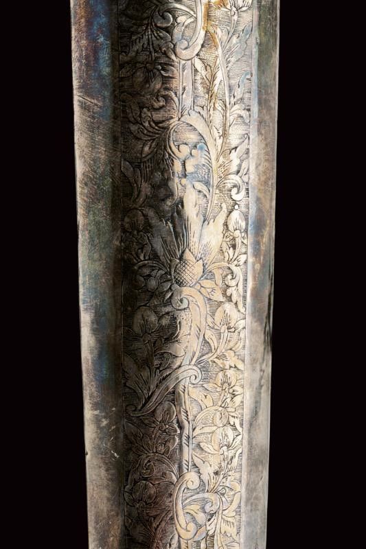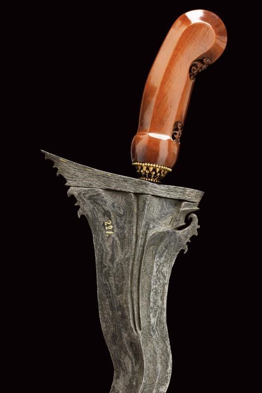 datazione: XVIII/XIX Secolo provenienza: Yogyakarta, Larga lama a due fili ondulati, in pamor, con base intagliata e scanalata, probabilmente malesiana del XVIII/XIX secolo. Ukiran in legno leggermente scolpito, mendak in ottone. Warangka in legno con pendok in lamina d'argento, finemente inciso, recante un volatile e disegni floreali. Montatura giavanese del XIX secolo. lunghezza 47.3 cm.