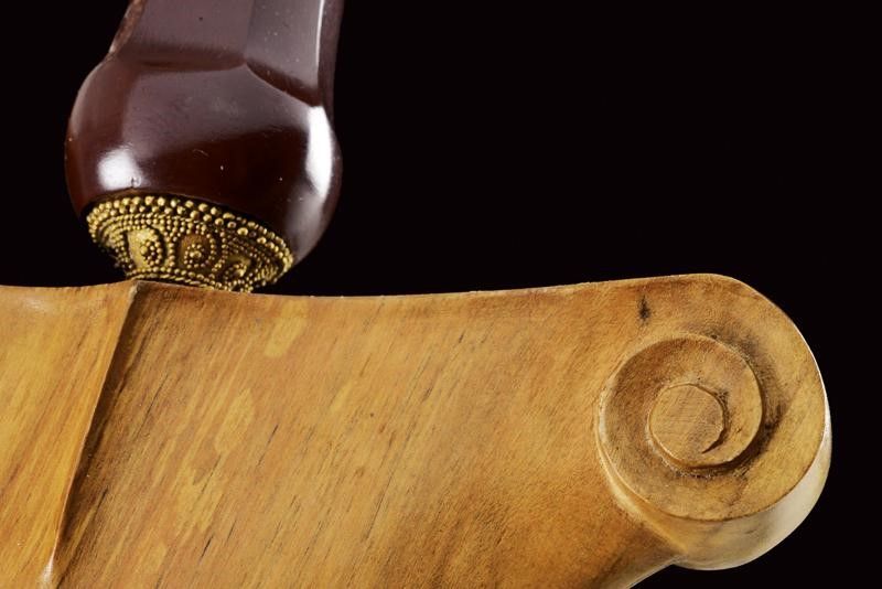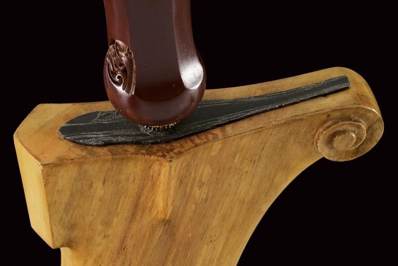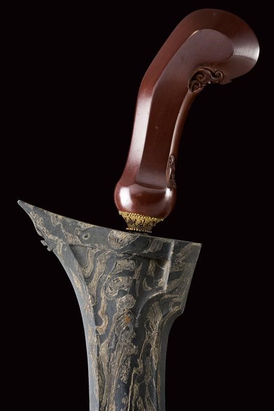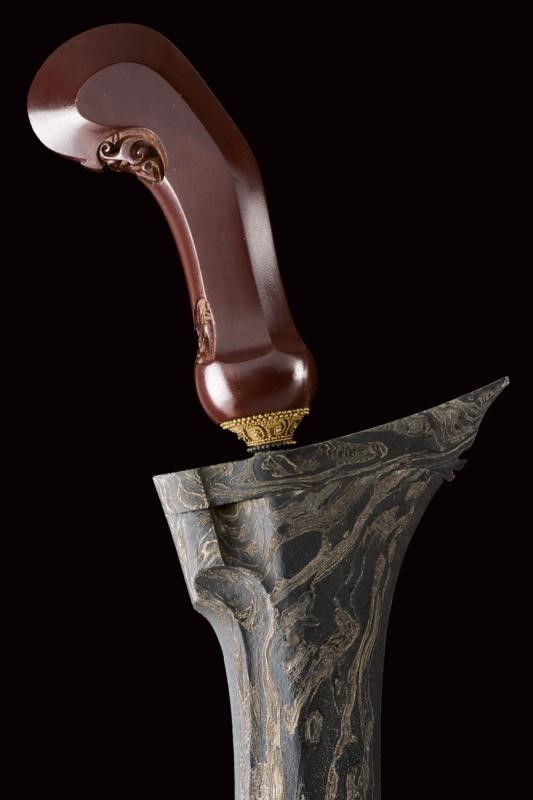datazione: XX Sec. provenienza: Surakarta, Larghissima e pesante lama in finissimo pamor con leggero sguscio. Ukiran in legno scolpito nel tipico stile, con piccoli fregi floreali. Fodero in un solo pezzo. Interessante. lunghezza 39.8 cm.