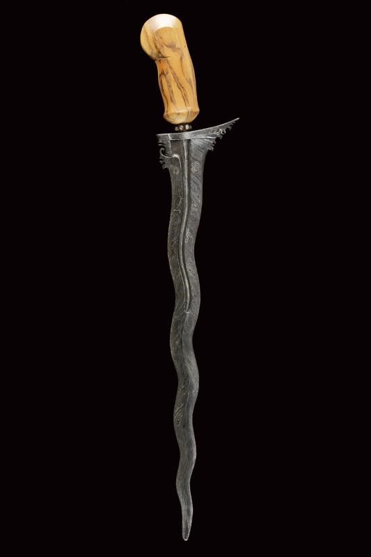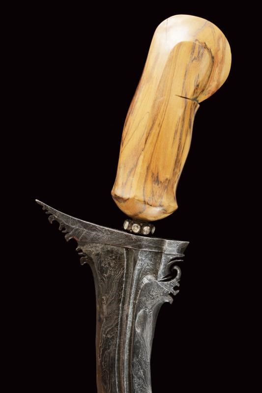 datazione: fine del XX Sec. provenienza: Bali, Imponente lama a due fili ondulati, in fine pamor untiran di origine madurese, intagliata e scanalata alla base. Mendak in metallo decorato con pietre a cabochon. Ukiran in legno scolpito. lunghezza 63 cm.