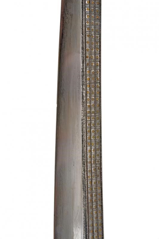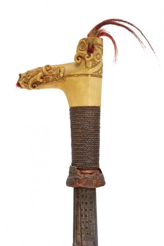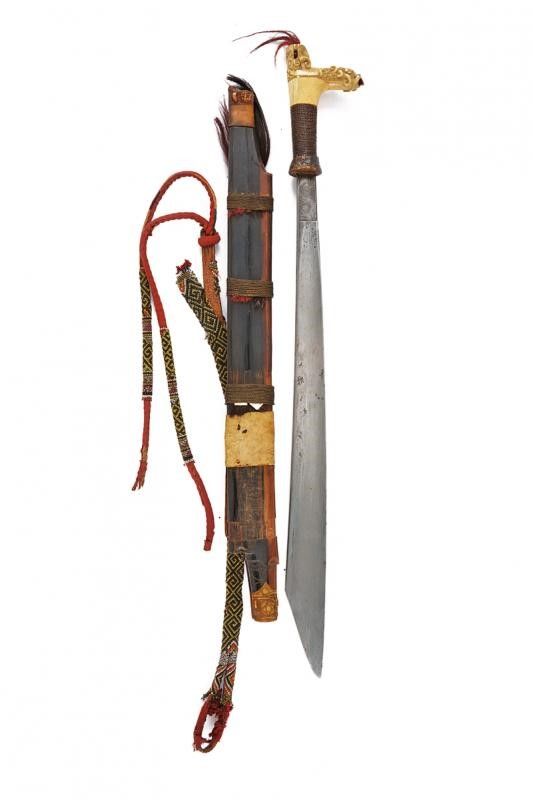 datazione: XIX Secolo provenienza: Borneo, Buona lama dritta con tipica decorazione dei Kajan di Sarawak in stile using-betung (con agemine in metallo giallo ma senza intagli sul dorso) con tre file a piccoli rettangoli o quadrati con un cerchio in ottone al centro; il dorso decorato en suite nel primo terzo. Bella impugnatura in corno di cervo, scolpita e decorata con crine rosso, la base rivestita di trecciola in fibra vegetale (piccola mancanza). Fodero in legno con fornimenti in corno scolpito, decorato a bande in filo di metallo, con crine colorato e munito di guaina per un piso raout. Bellissima cinghia di sospensione decorata a perline colorate e con tessuto rosso (tipico di Sarawak). Raro. lunghezza 73.5 cm.