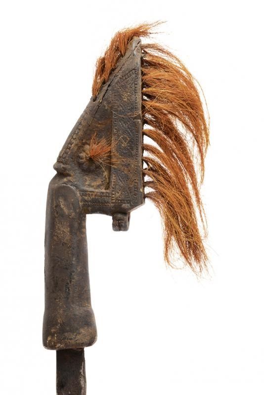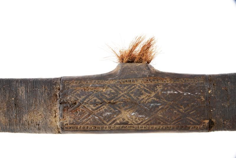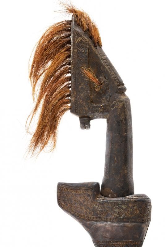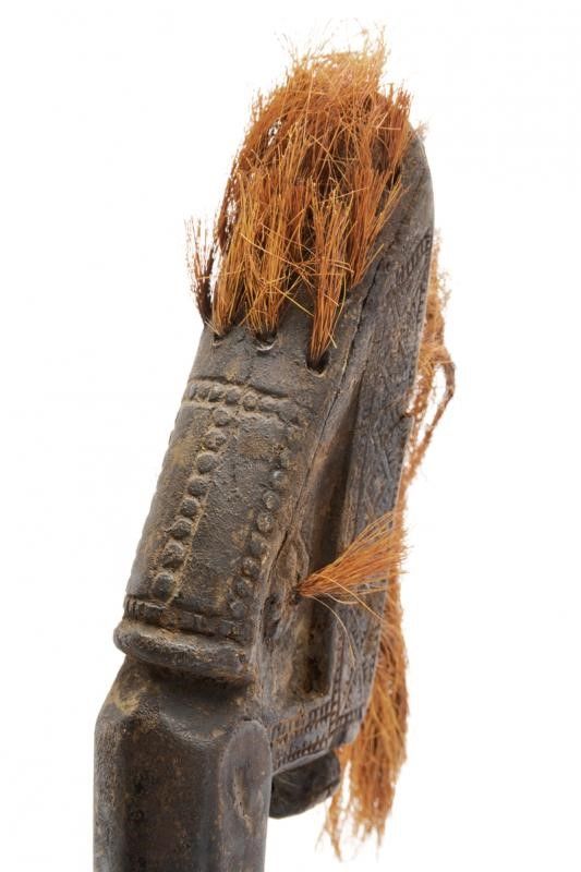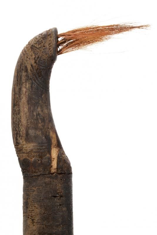 datazione: XIX Secolo provenienza: Isola Alor, Lama dritta a un filo con punta triangolare, la superficie con danni da ruggine. Fornimento in legno scolpito nella tipica foggia e decorato con crine di cavallo. Fodero in legno lavorato e decorato en suite. Lacci in tessuto. Raro. lunghezza 65 cm.