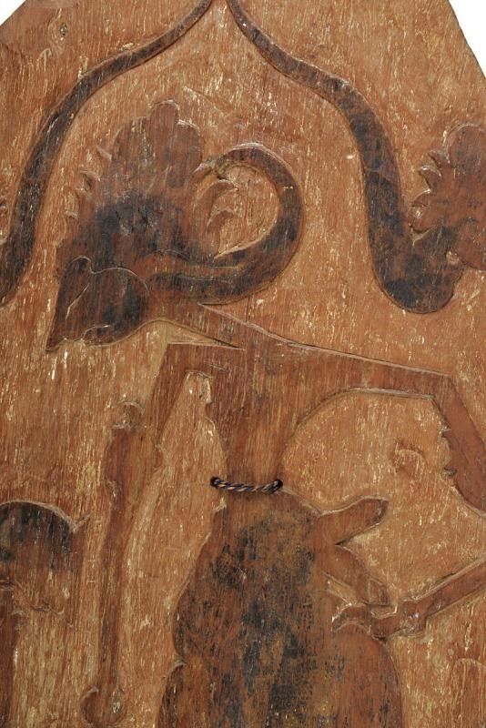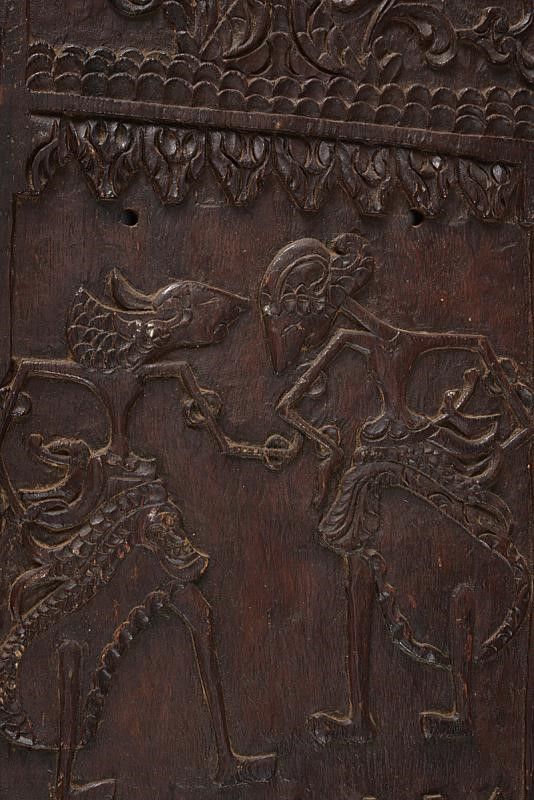 datazione: 1900 circa provenienza: Indonesia, Uno recante due figure antropomorfe intagliate in bassorilievo. L'altro recante due figure intagliate (una con un kris), draghi, animali e decorazioni floreali. Vedi un panello simile in 'Keris Jawa' di Haryono Haryoguritno, a pagina 386, ill. 8.10. altezza 60.5 - 61 cm.