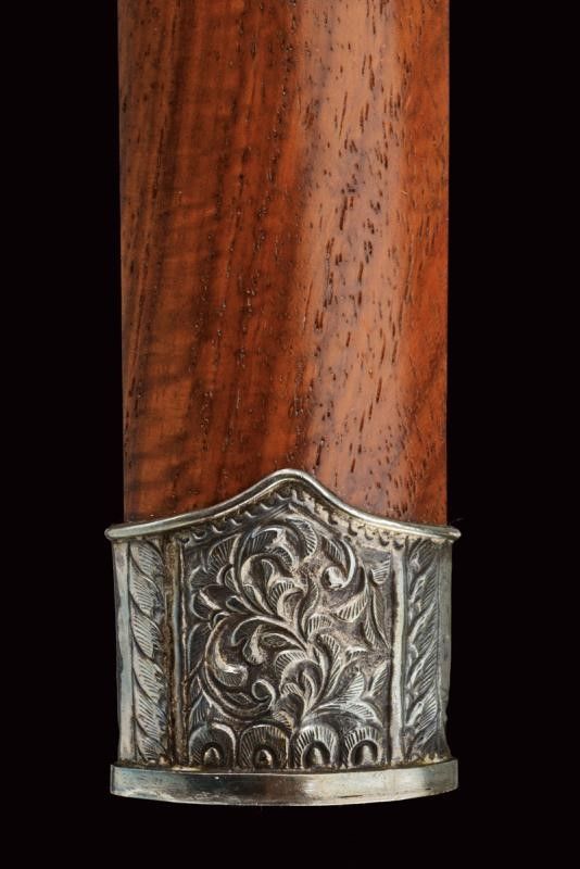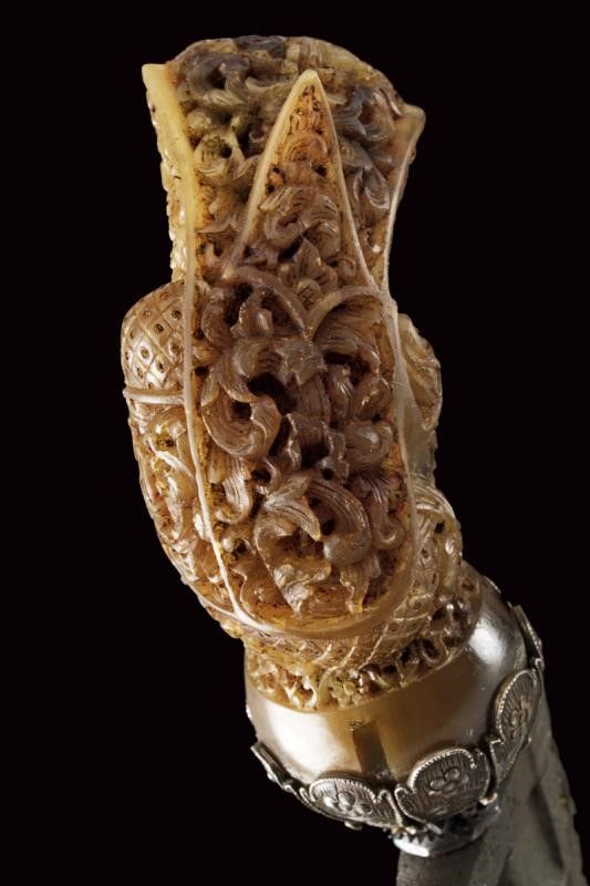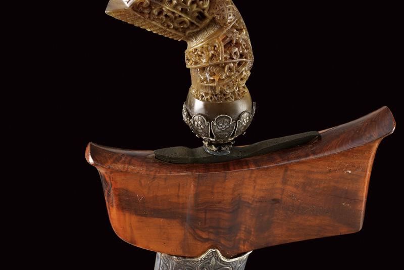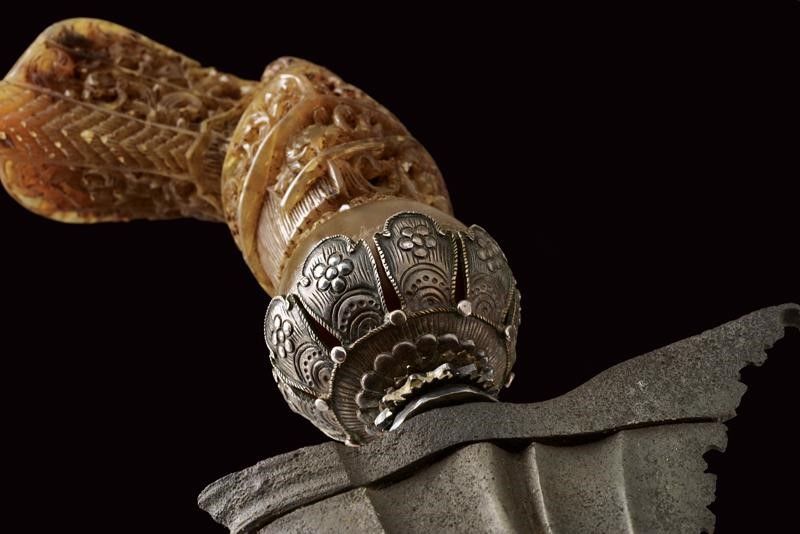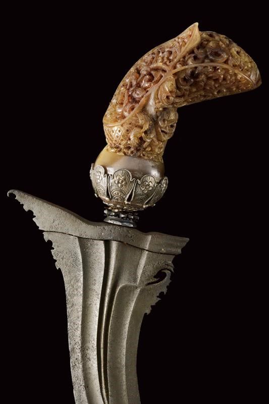 dating: 19th Century provenance: Sumatra, Undulated, double-edged blade with grooves all over its length, carved base. Beautiful, horn ukiran richly sculpted and pierced with floral and geometrical motifs. Metal mendak and engraved silver seluk. Scabbard made of fine wood, with three silver mounts embossed with floral motifs. length 45 cm.
