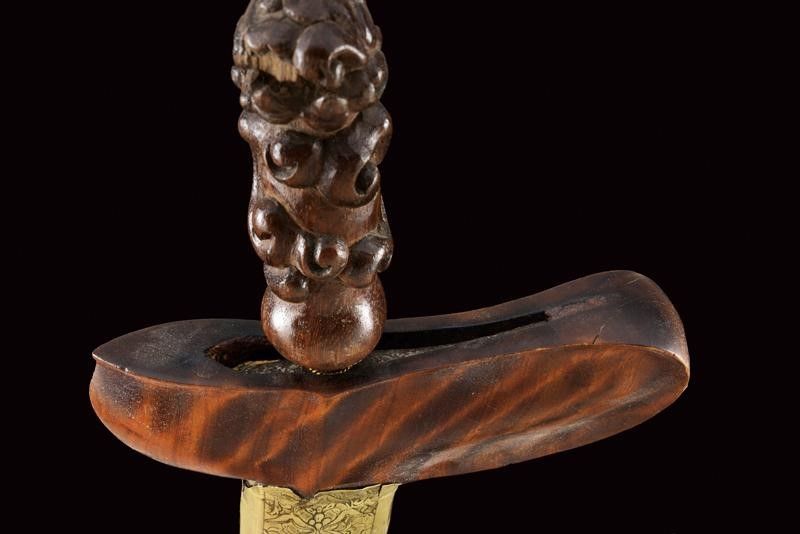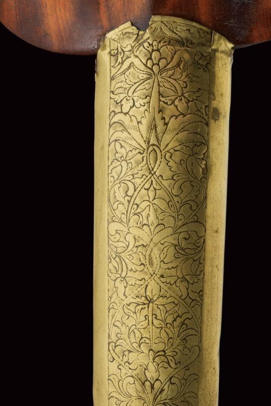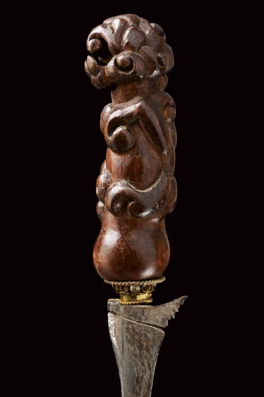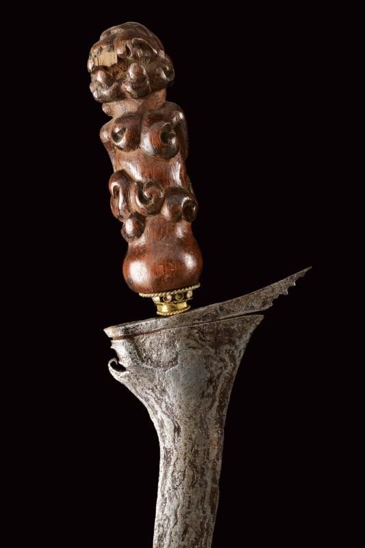 datazione: XIX Secolo provenienza: Giava, Lama di sezione lenticolare a due fili ondulati e base leggermente intagliata e con breve sguscio. Impugnatura in legno scolpito. Warangka in legno con pendok in lamina d'ottone incisa a motivi floreali. Piccole mancanze. lunghezza 43.7 cm.