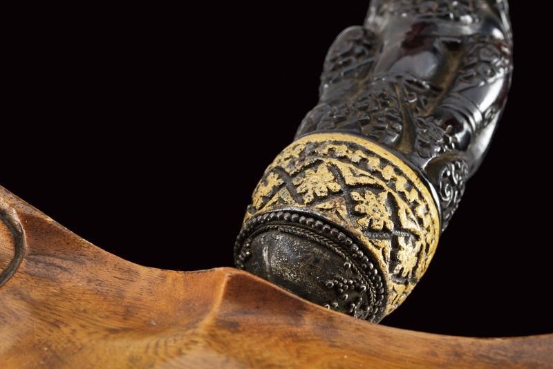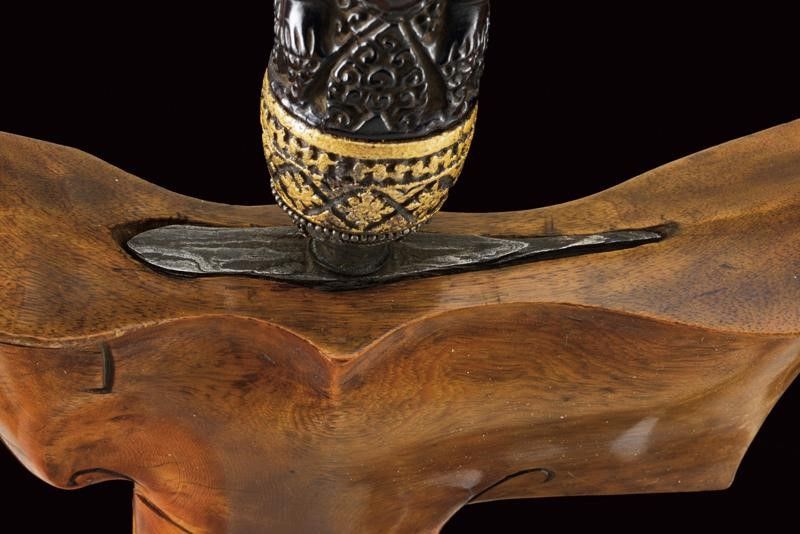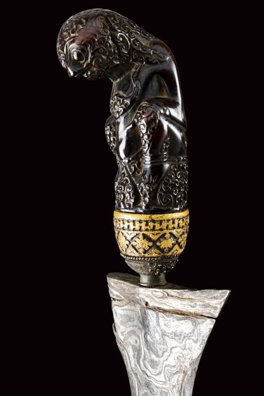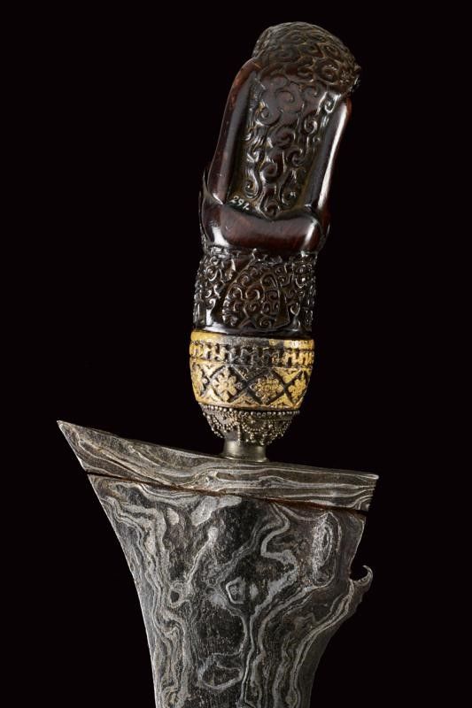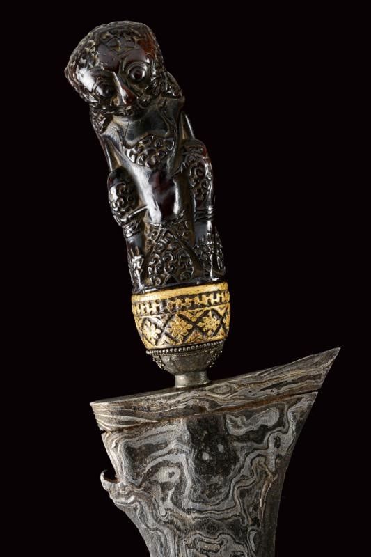 datazione: XVIII/XIX Secolo provenienza: Giava, Bella lama a due fili ondulati in fine pamor, con base leggermente intagliata e recante breve sguscio. Ukiran in legno finemente scolpito a raffigurare una divinità, selut in metallo con decorazioni in filigrana (mancanze). Elegante fodero in due legni diversi. La lama probabilmente del XVIII secolo, il resto del XIX secolo. lunghezza 47 cm.