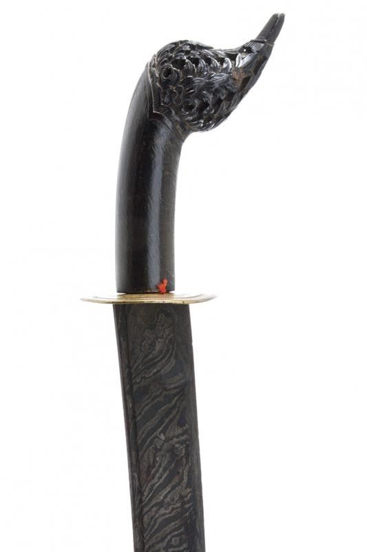 datazione: XIX Secolo provenienza: Sumatra, Robusta lama a un filo con scanalatura dorsale, in bellissimo pamor. Impugnatura in corno scuro riccamente scolpita a motivi floreali lavorata a forma di becco stilizzato. Elso a disco in ottone. Fodero in legno. Sumatra meridionale. lunghezza 73.5 cm.
