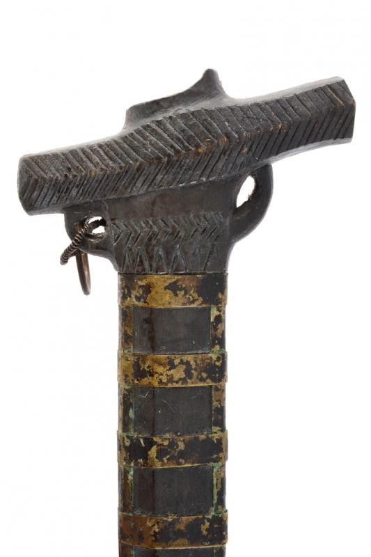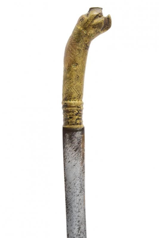 datazione: Fine del XIX Secolo provenienza: Nias, Lama a un filo leggermente crescente verso il debole, con punta incavata al dorso. Impugnatura in ottone con pomo angolato. Fodero in legno con cappa scolpita e fornimenti a bande in ottone. Raro. lunghezza 59 cm.