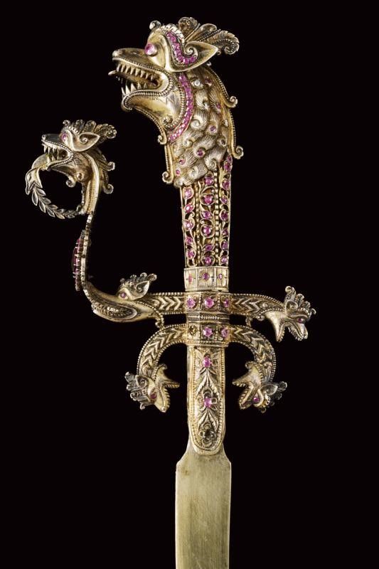 datazione: 1910 - 1920 provenienza: Ceylon, Lama piatta e sottile in argento. Fornimento in argento massiccio con alette fermafodero poste fra due archetti terminanti a testa di drago. I bracci dell'elso decorati en suite, la guardia di forma incurvata, terminante a testa di drago. Il grande pomo a testa di drago con fauci aperte e lingua sporgente. Impugnatura faccettata (una faccetta mancante) e finemente traforata. Il tutto con eleganti incisioni a motivi floreali e geometrici. Fodero in argento inciso e riccamente traforato a motivi floreali. Cappa liscia dotata di quattro anelli di sospensione e con bordi decorati ad intreccio. Puntale a testa di drago (raro). Impugnatura e fodero ornati con numerose pietre semipreziose (mancanze) prevalentemente di colore rosa, alcune bianche; una grande pietra sulla guardia di color rosso scuro e due grandi pietre colore fumè e giallo sulla testa del drago al puntale del fodero. Una rarissima kastane: da tanto tempo non si vede un esemplare di simile qualità sul mercato mondiale. Vedi un'esemplare molto simile al Museo di stato dell'Ermitage, illustrato in Obrtztsov (2015, pag. 124). lunghezza 46 cm.