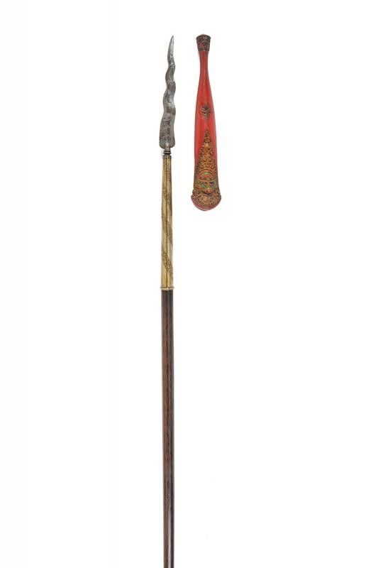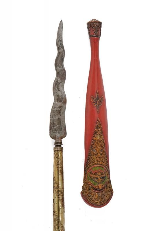datazione: XIX Secolo provenienza: Bali, Lama in fine pamor a due fili ondulati. Nodo a disco. Su fusto cilindrico in legno con fornimento in lamina d'argento inciso a bande oblique a motivi floreali. Bellissimo fodero in legno riccamente scolpito, con mascherone e decorazioni floreali in rilievo decorati in policromia. lunghezza 228 cm.